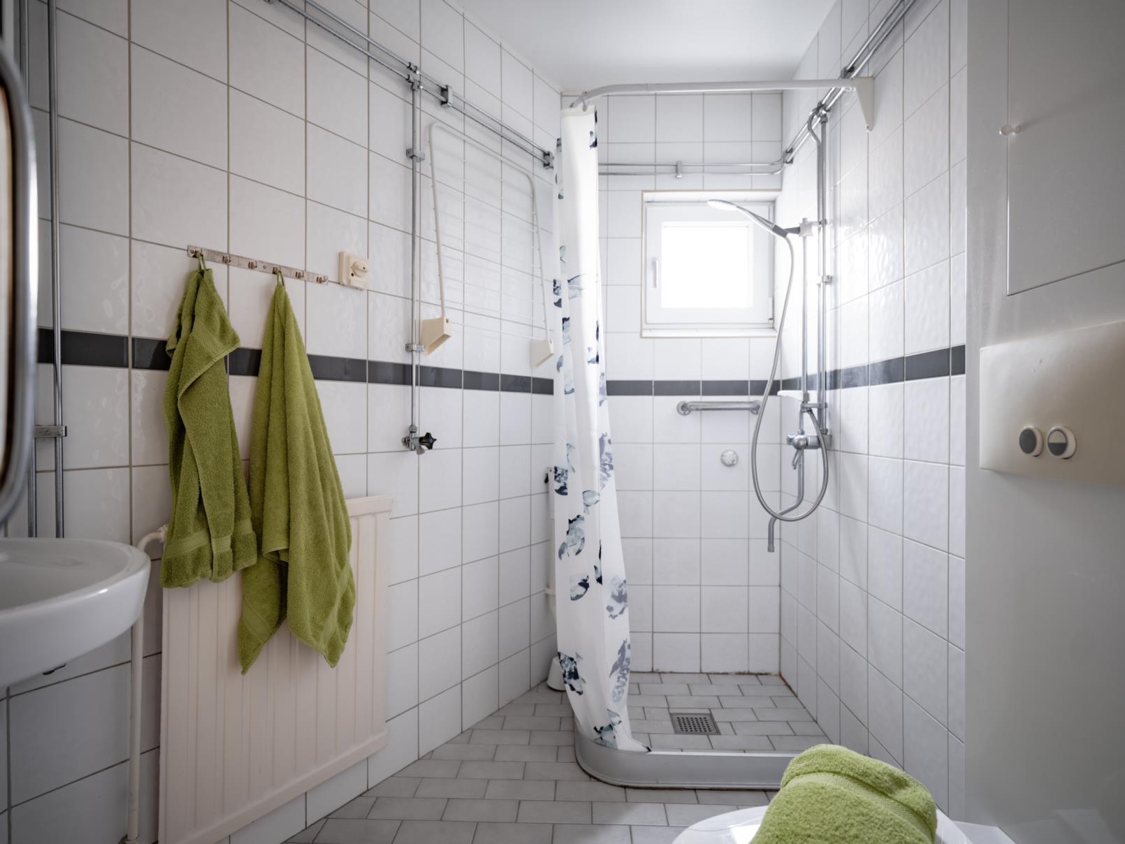 Kaklat badrum med klinkergolv utrustat med WC, handfat och dusch.
