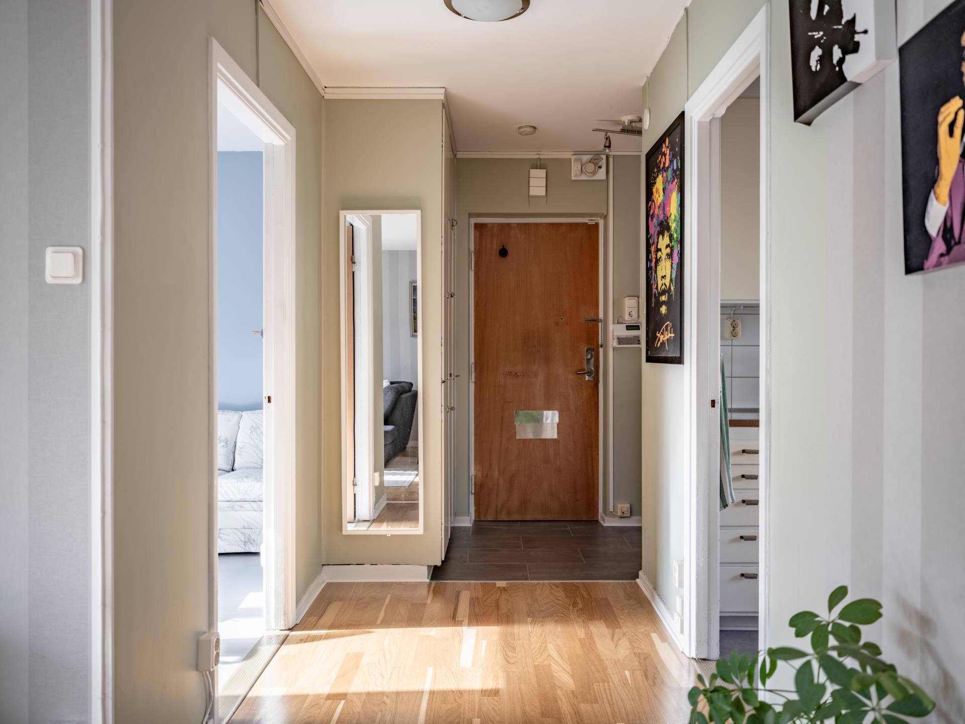 Välkomnande hall med ljusa väggar och mörkt laminatgolv som löper vidare in i köket och skapar ett enhetligt första intryck. Här finns plats för avhängning direkt vid entrén samt praktisk förvaring i garderober.