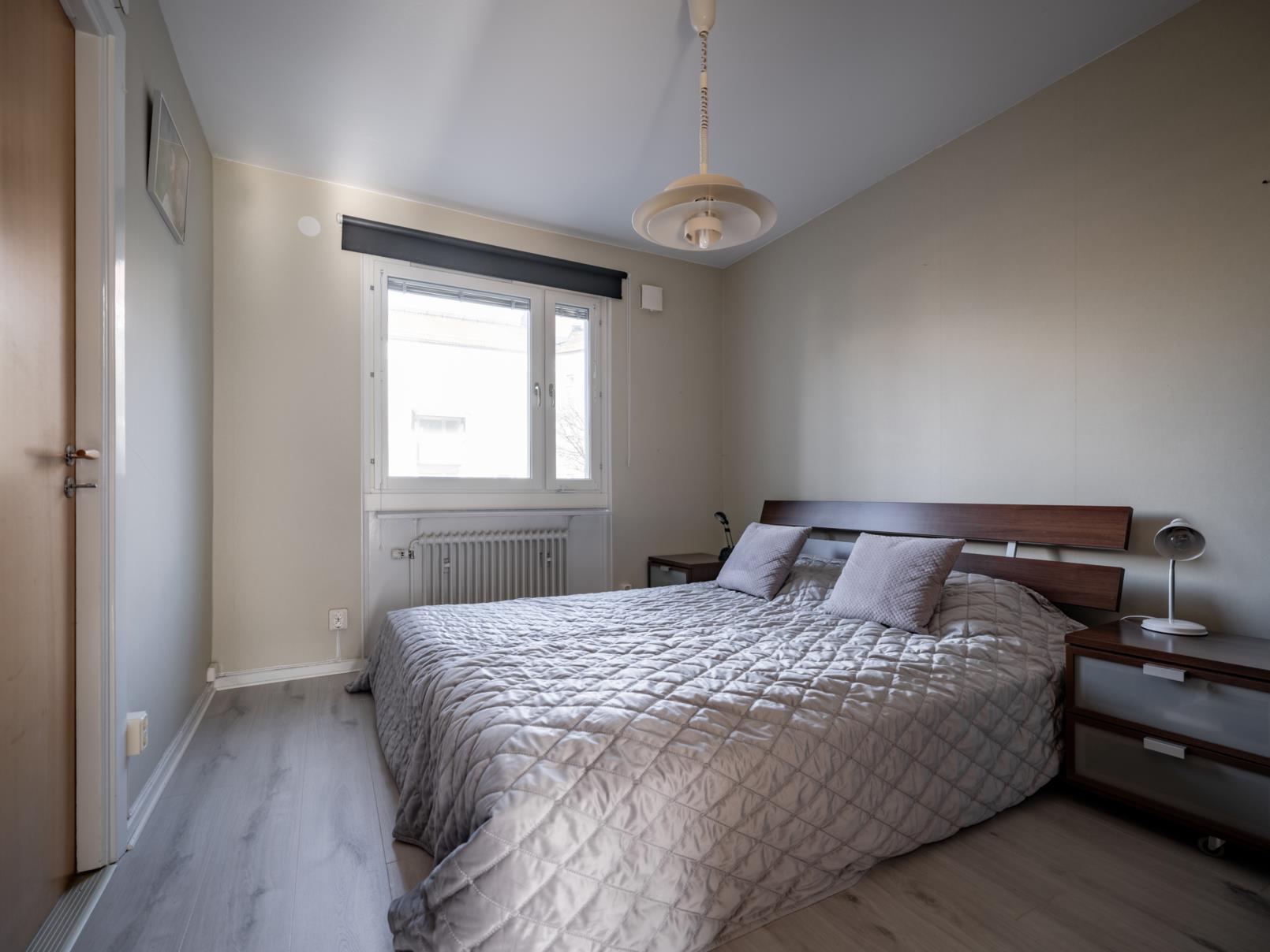 Här finns två rymliga sovrum, där ett nås både från köket och hallen, vilket ger flexibilitet och smart separation mellan sociala ytor och privata rum. Ljusa väggar och generöst ljusinsläpp från flera väderstreck skapar en öppen och inbjudande atmosfär.