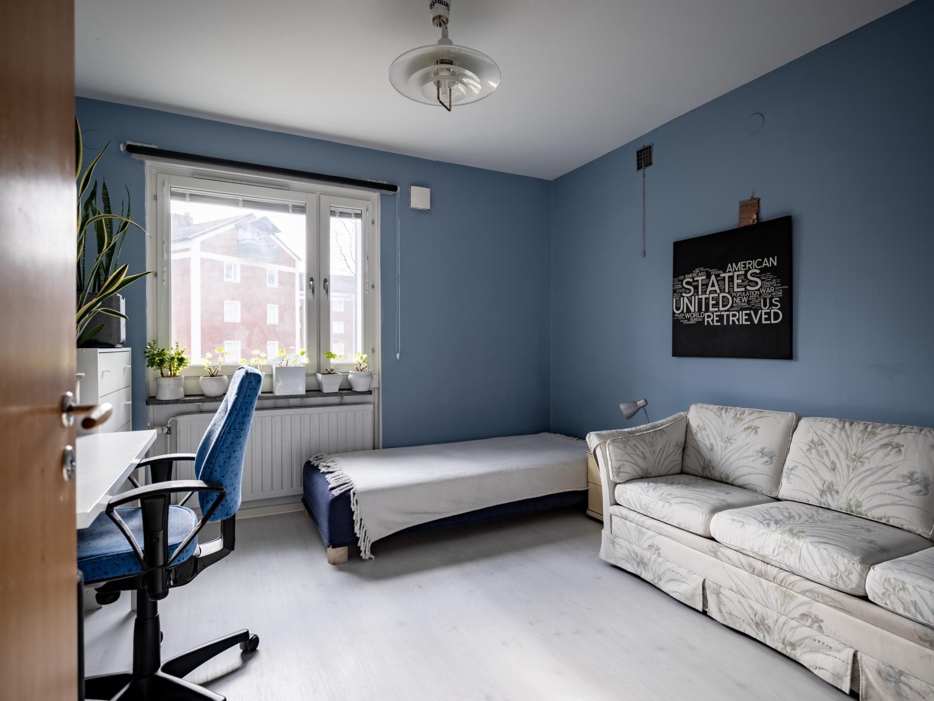Ytterligare ett bra sovrum med ljust golv och väggar i blå ton som ger rummet en personlig karaktär. Här finns plats för säng, skrivbord eller annan möblering efter behov.