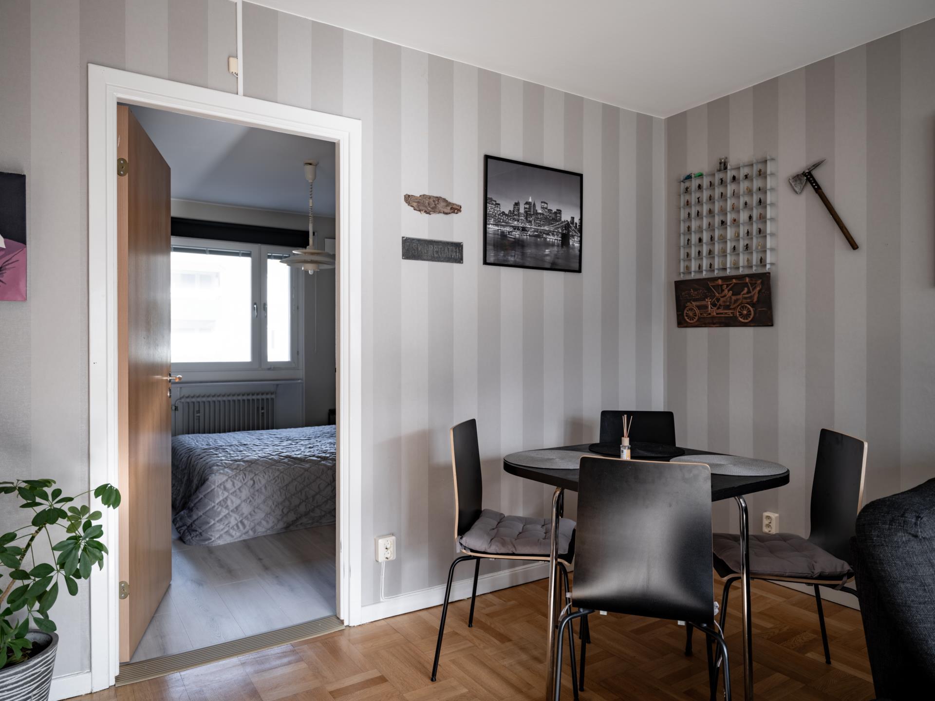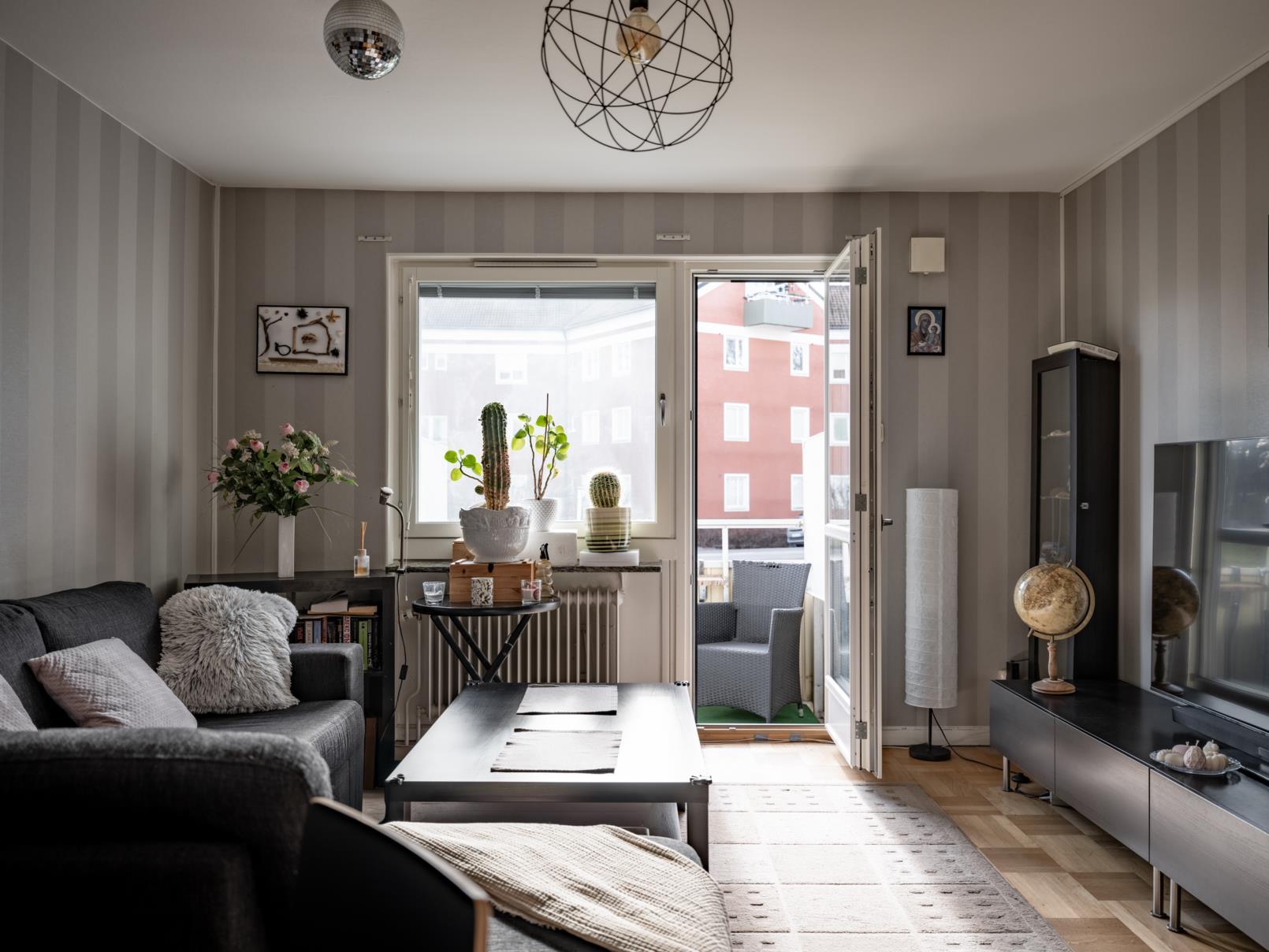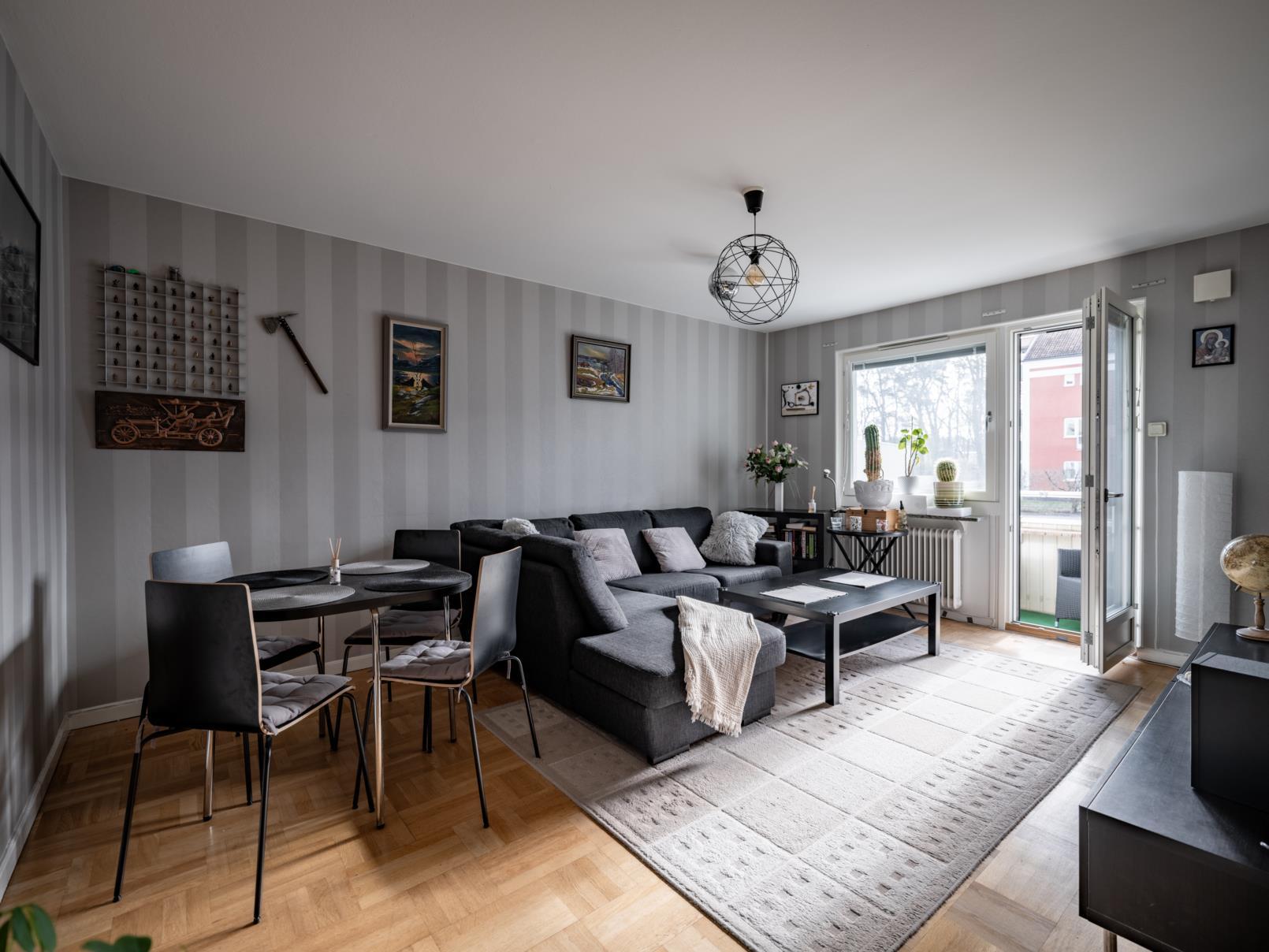 Ljust och lättmöblerat vardagsrum med klassiskt parkettgolv och tapetserade väggar som ger en hemtrevlig atmosfär. Här finns gott om plats för både soffgrupp och matplats om så önskas. Från vardagsrummet nås bostadens balkong som blir en naturlig förlängning av rummet under årets varmare månader.