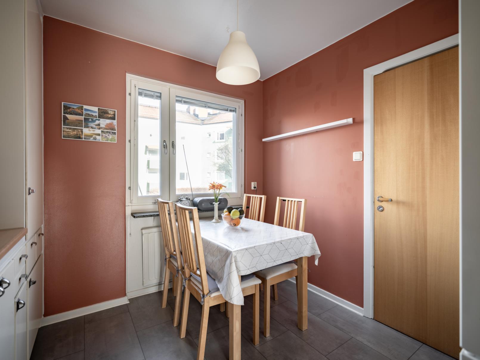 Trivsamt kök med målade väggar i en varm roströd ton som ger rummet karaktär och en ombonad känsla. Det mörka laminatgolvet fortsätter även här och tillsammans med den funktionella planlösningen skapas en praktisk arbetsyta. Köket är utrustat med spis, kyl och frys samt erbjuder plats för matbord intill fönster.