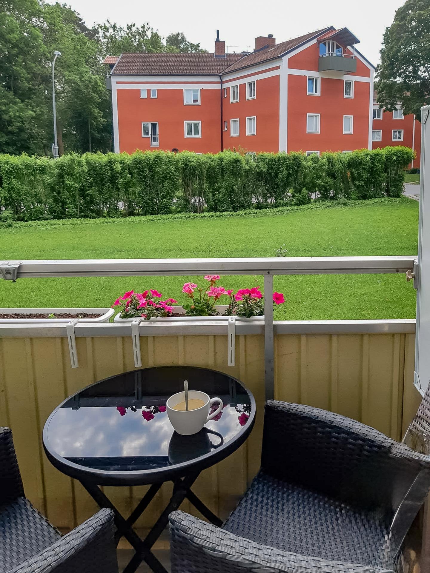 - BalkongJa. Balkongen har ett trevligt läge med lite morgonsol och lite tidig eftermiddagssol, samt sol under förmiddagen som ger ljus och värme större delen av dagen. Här finns gott om plats för bord och stolar, vilket gör balkongen till en mysig plats för frukost, fika eller avkoppling i friska luften.