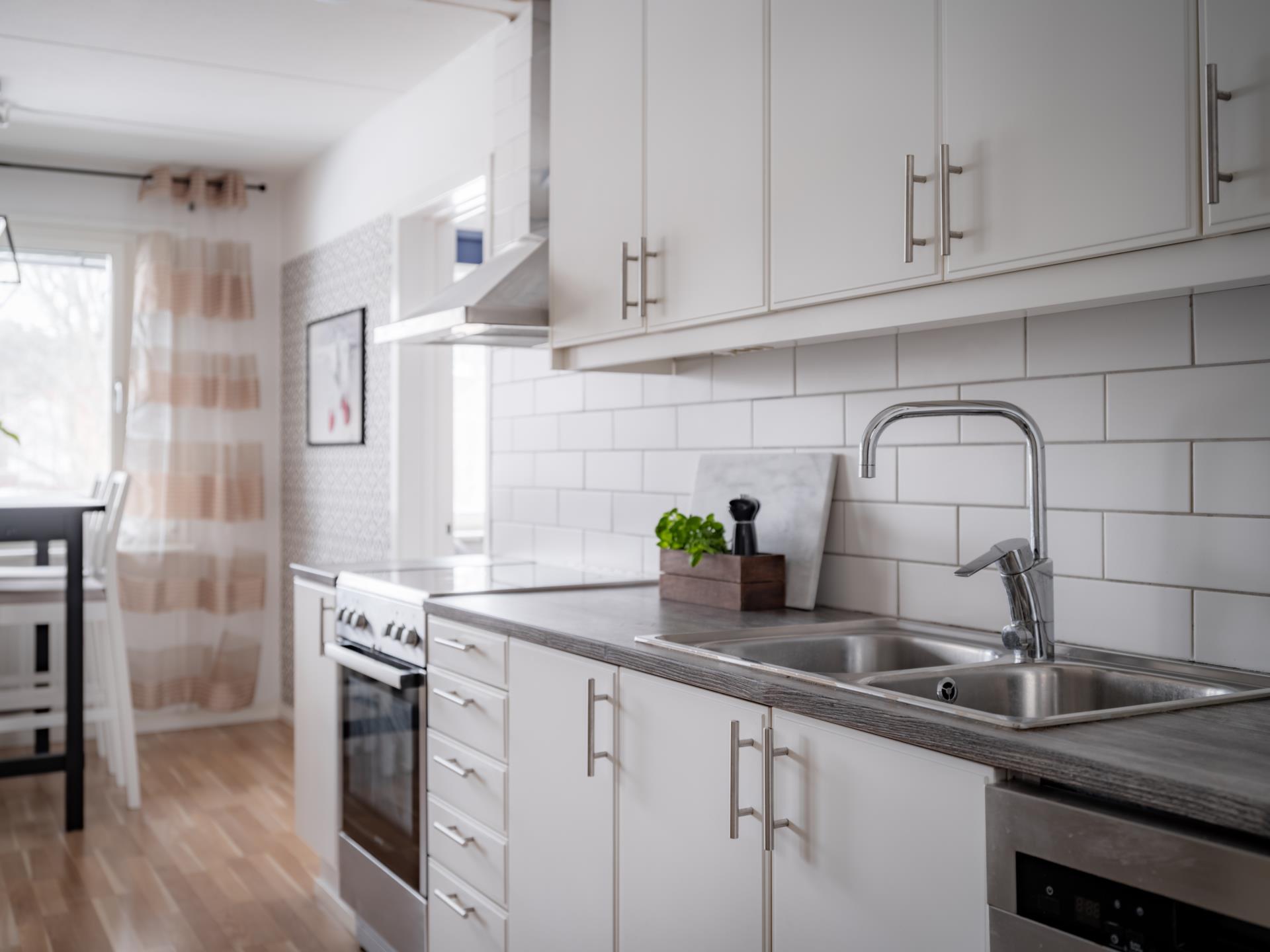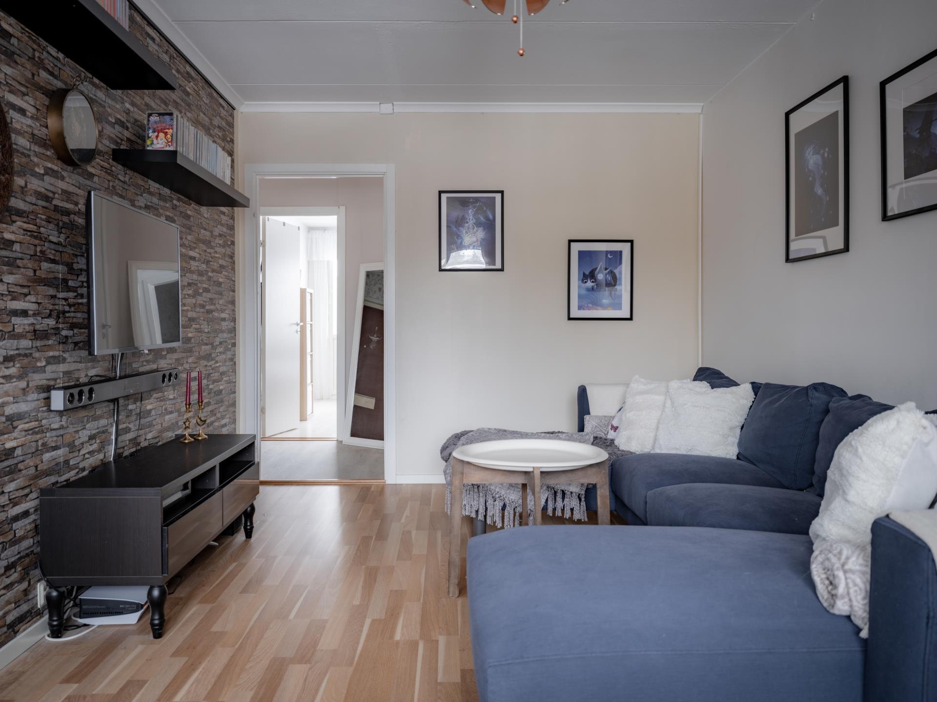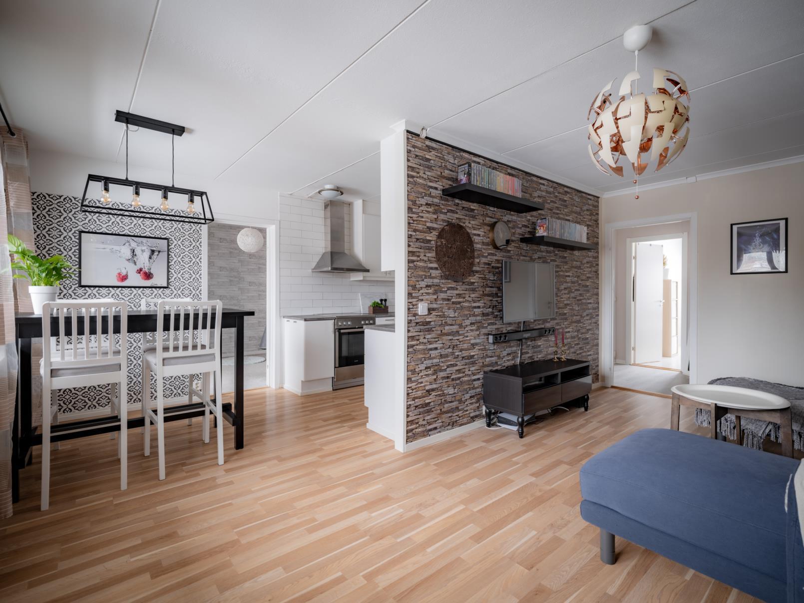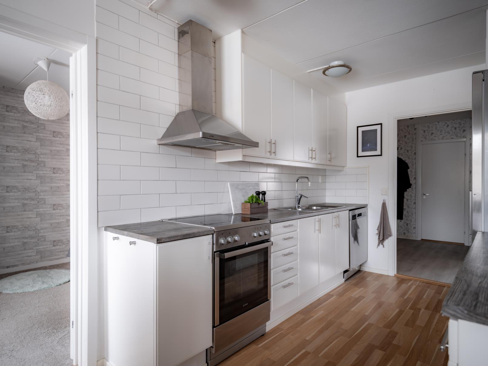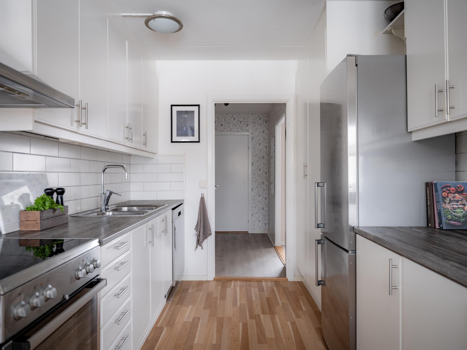 Hissen tar dig smidigt upp till lägenheten, där du möts av ett ljust laminatgolv och väggar i behagliga toner. Den genomtänkta planlösningen skapar ett harmoniskt flöde mellan kök, matplats och vardagsrum, där stora fönster släpper in rikligt med ljus och ger en härlig känsla av rymd. Köket är stilrent med vita luckor, liggande kakel och laminatbänkskiva, utrustat med kyl/frys, spishäll, ugn, diskmaskin och fläkt i rostfritt – perfekt för både vardagsmatlagning och sociala tillfällen. Vardagsrummet är rymligt och inbjudande med plats för både soffgrupp och mediamöbel, och från rummet nås den stora balkongen som fungerar som ett extra rum under årets varmare månader.