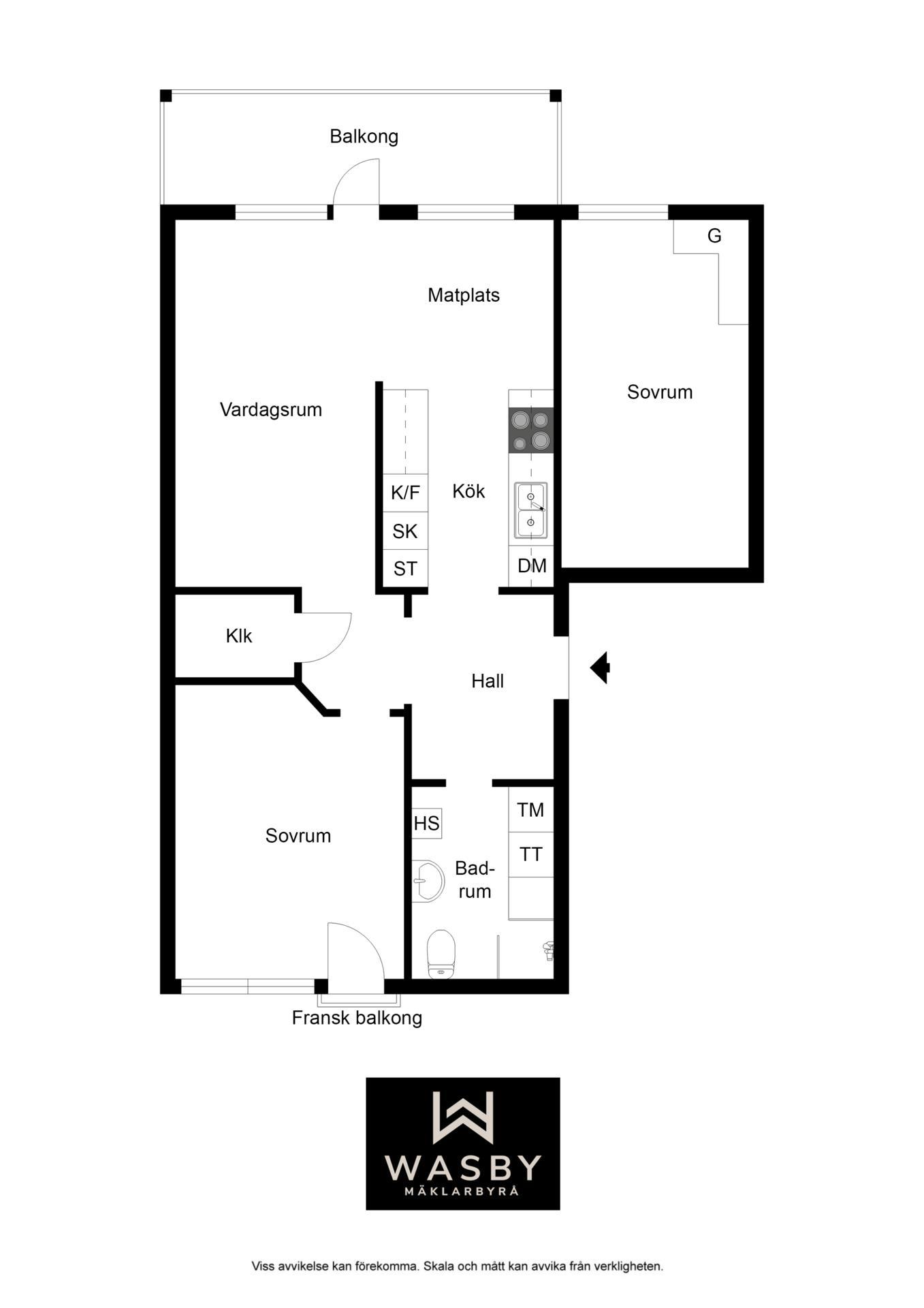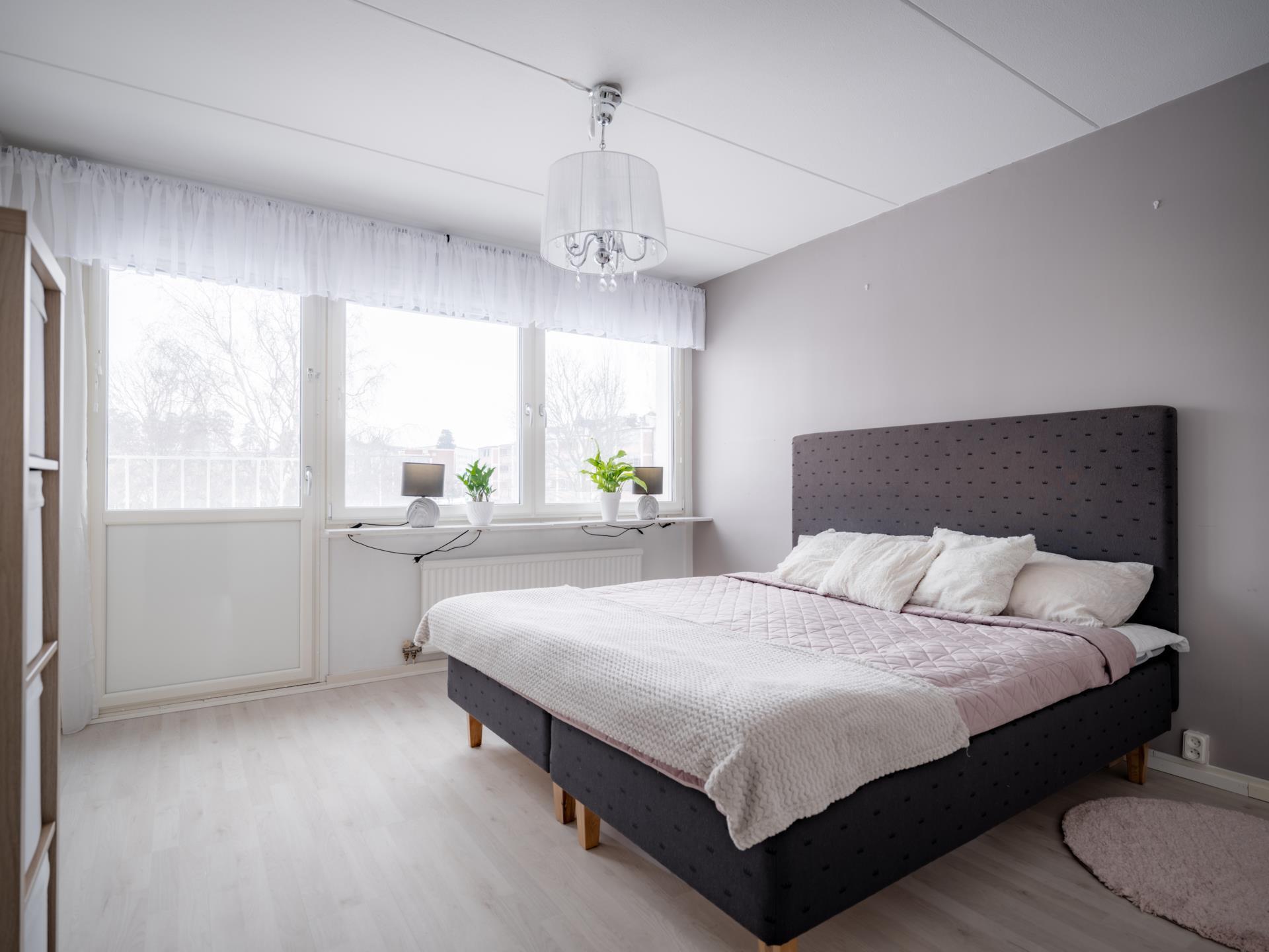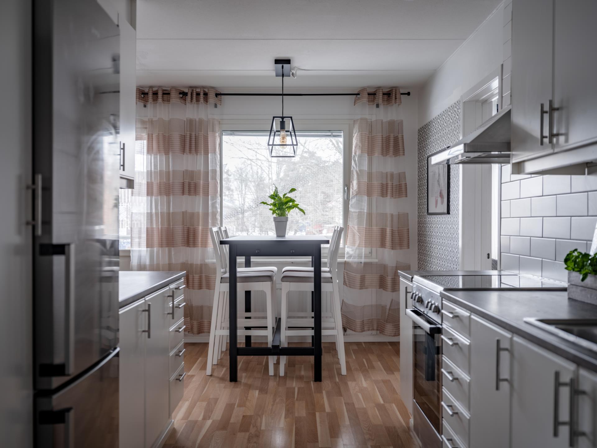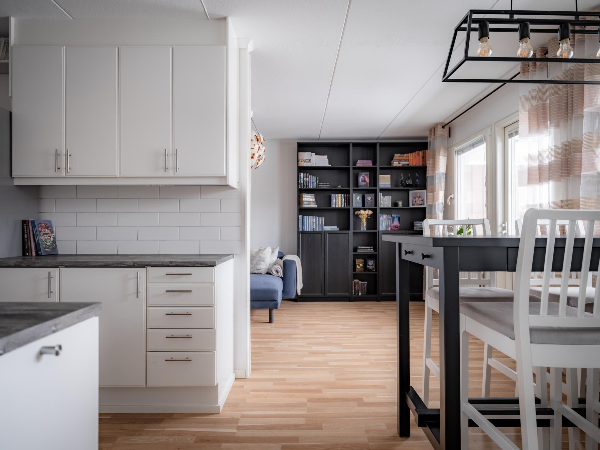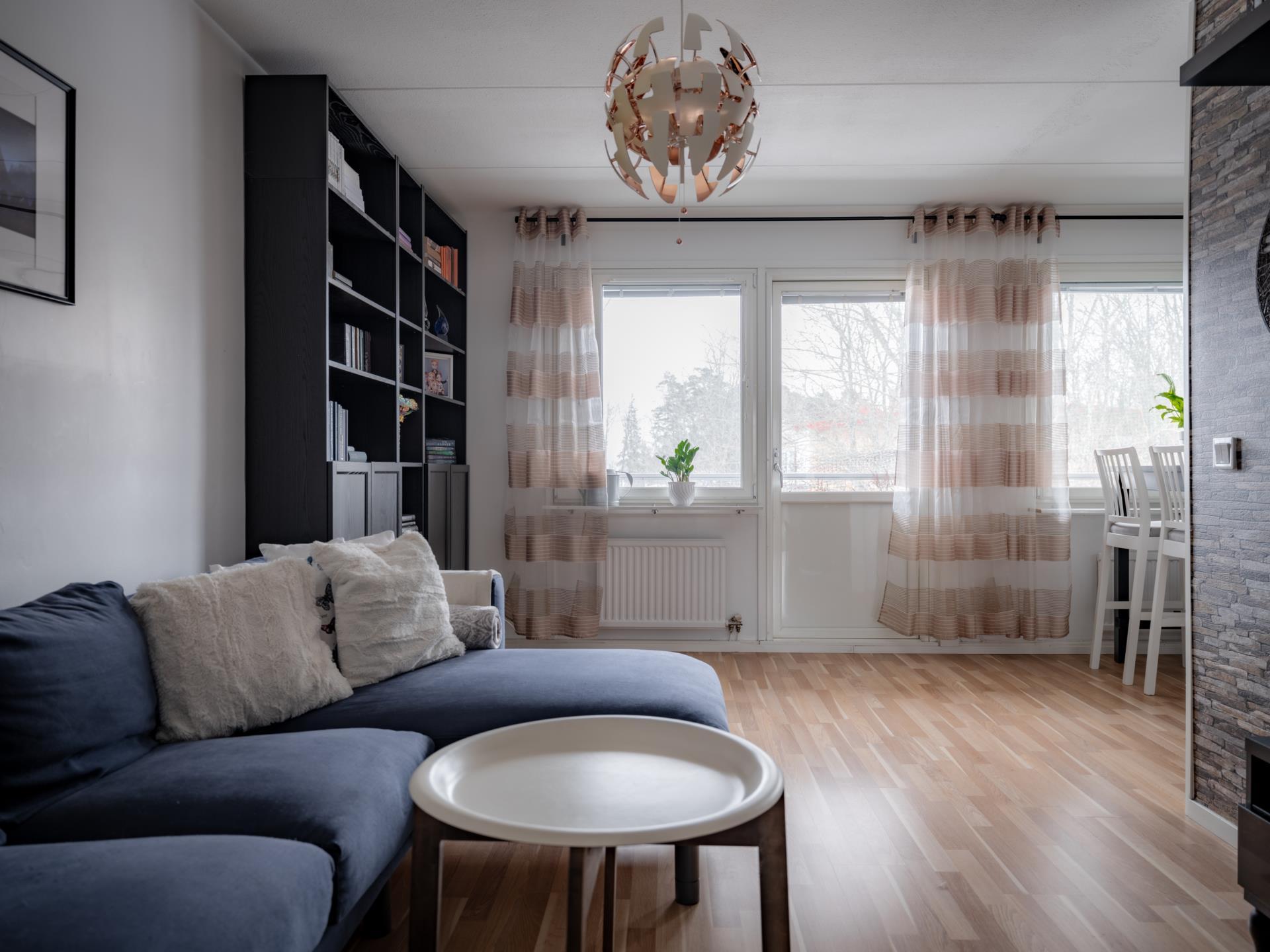 Hissen tar dig smidigt upp till lägenheten, där du möts av ett ljust laminatgolv och väggar i behagliga toner. Den genomtänkta planlösningen skapar ett harmoniskt flöde mellan kök, matplats och vardagsrum, där stora fönster släpper in rikligt med ljus och ger en härlig känsla av rymd. Köket är stilrent med vita luckor, liggande kakel och laminatbänkskiva, utrustat med kyl/frys, spishäll, ugn, diskmaskin och fläkt i rostfritt – perfekt för både vardagsmatlagning och sociala tillfällen. Vardagsrummet är rymligt och inbjudande med plats för både soffgrupp och mediamöbel, och från rummet nås den stora balkongen som fungerar som ett extra rum under årets varmare månader.