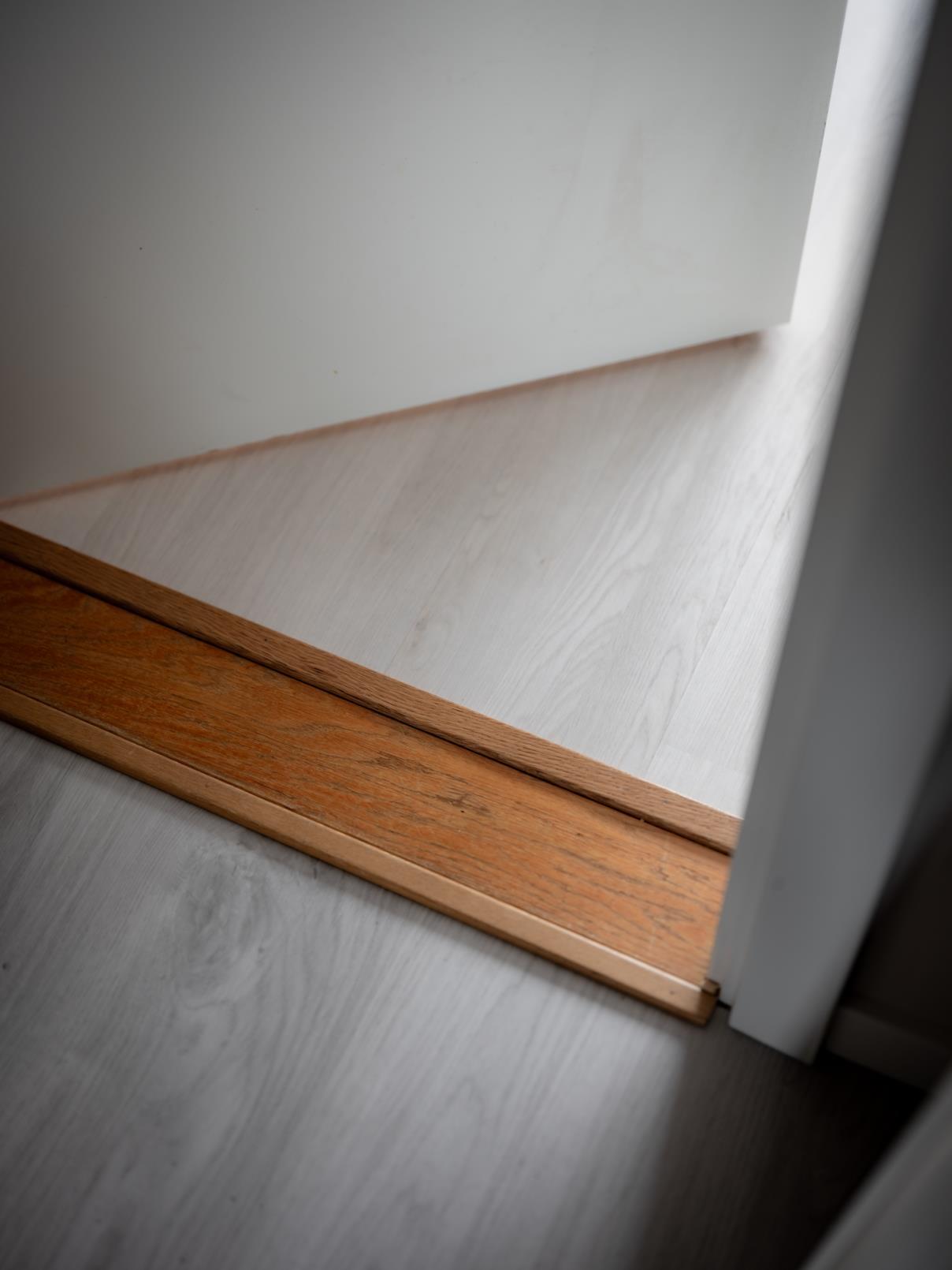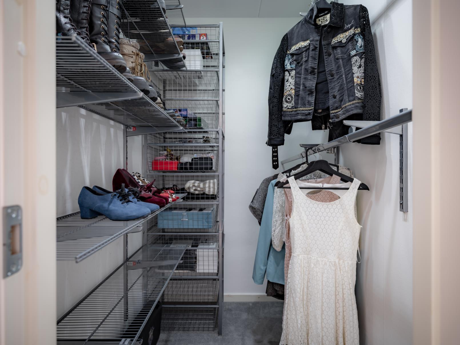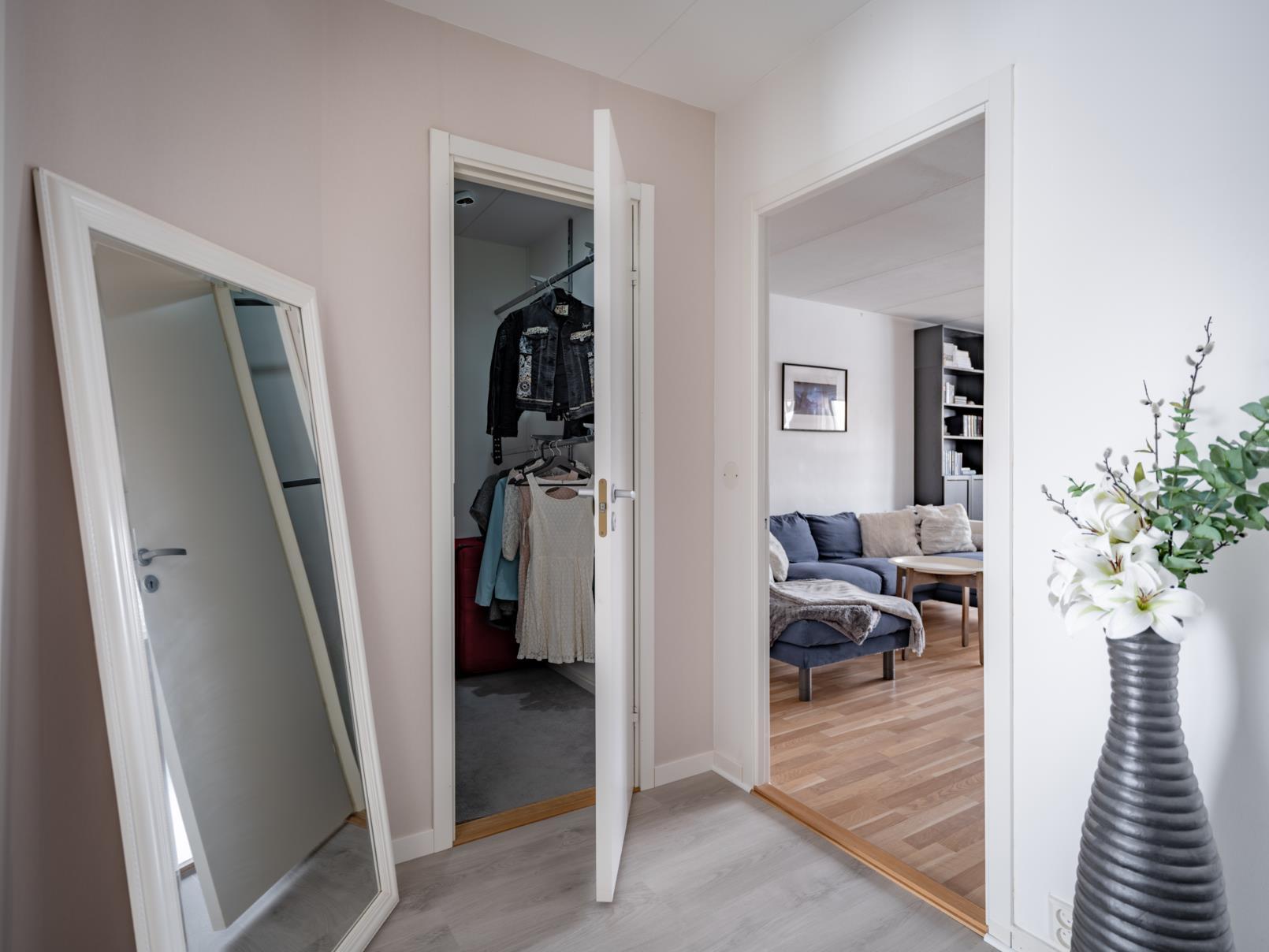 Ljust laminatgolv och beige tapet. Härifrån nås bostadens klädkammare som erbjuder utmärkt förvaring.