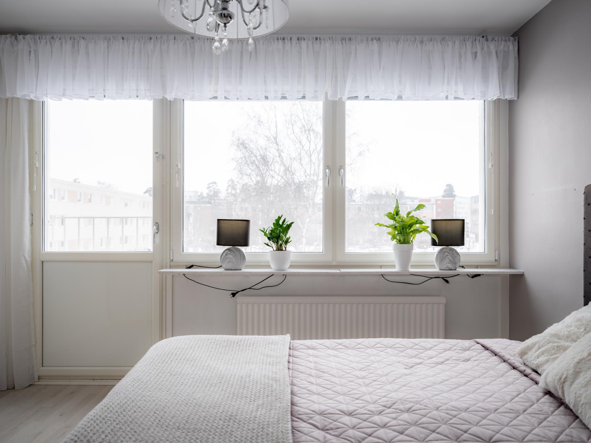 Ljust laminatgolv, vitmålade väggar och rosa fondvägg. Fransk balkong som ger extra ljusinsläpp. Rummet passar utmärkt som barnrum, gästrum eller hemmakontor.
