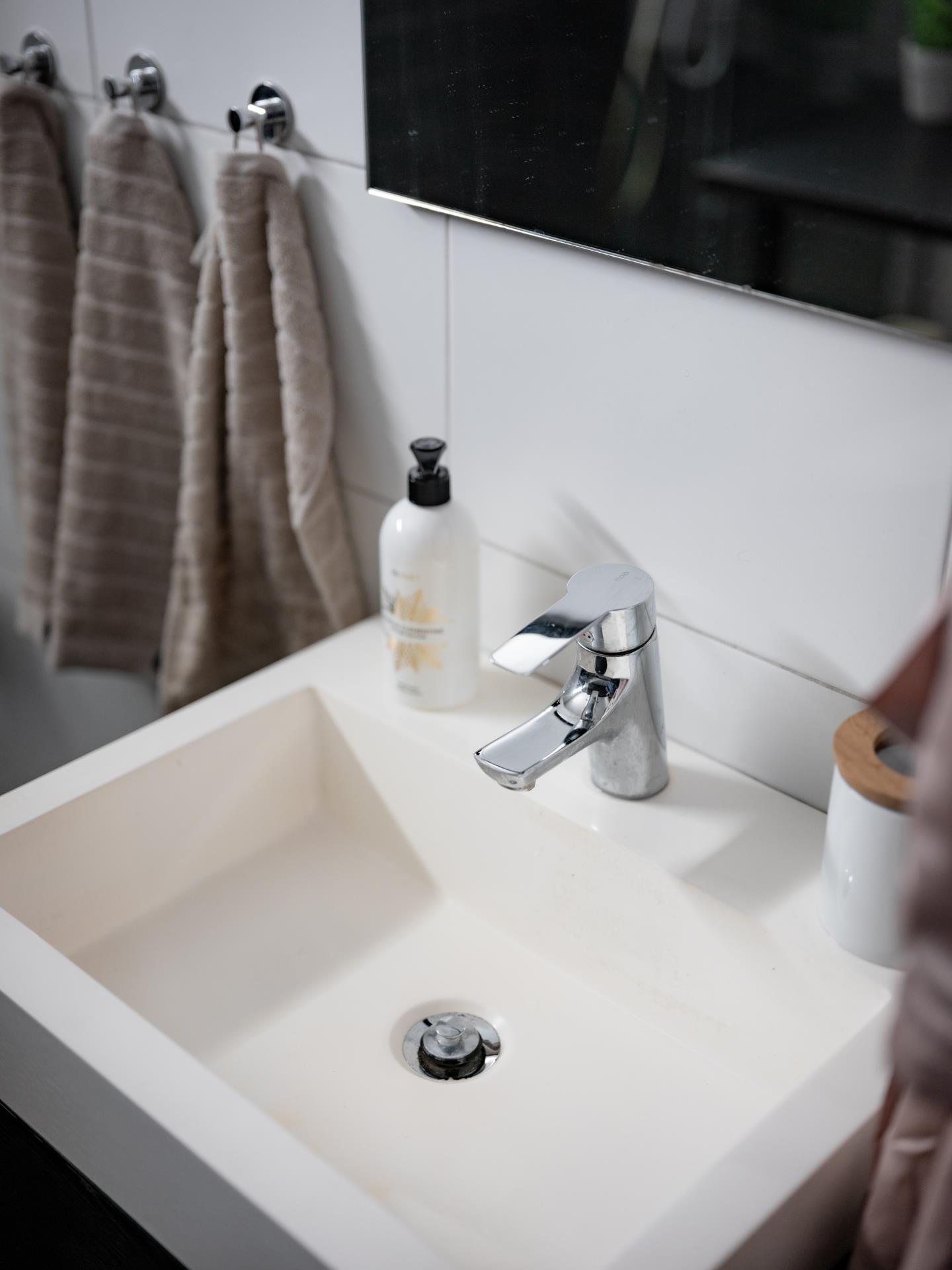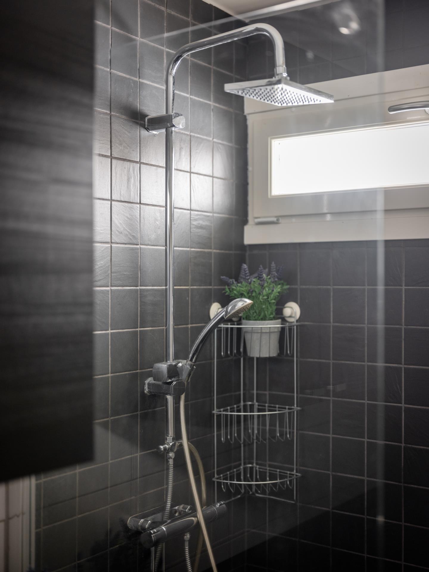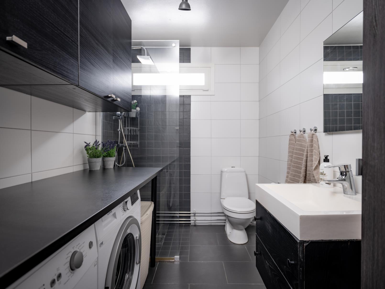 Renoverat 2014/2015. Svart klinkergolv med golvvärme och vita kaklade väggar. Duschhörna med svart kakel som stilren kontrast. Utrustat med wc, kommod, högskåp samt tvättmaskin och torktumlare med arbetsbänk och väggskåp ovanför.