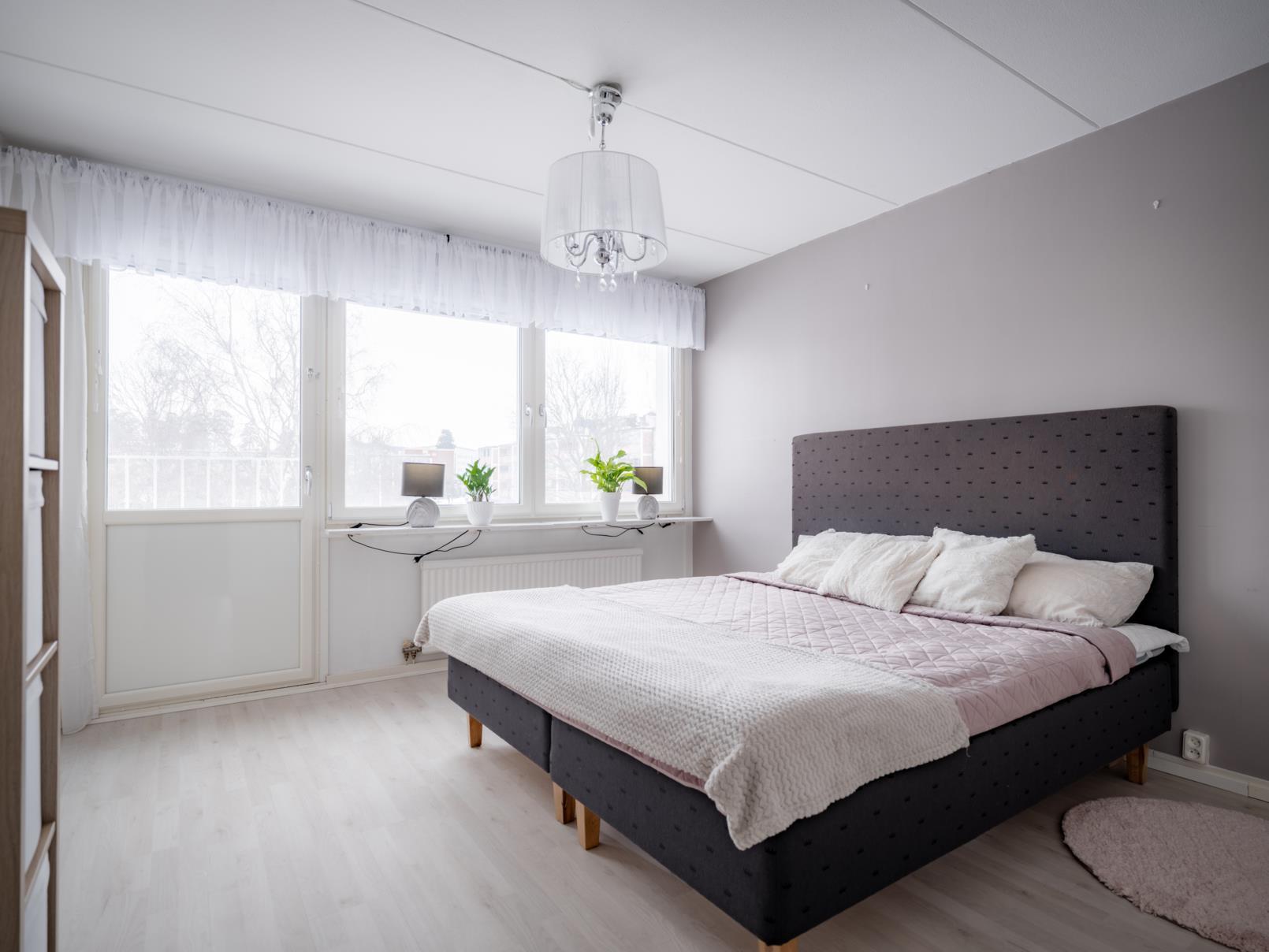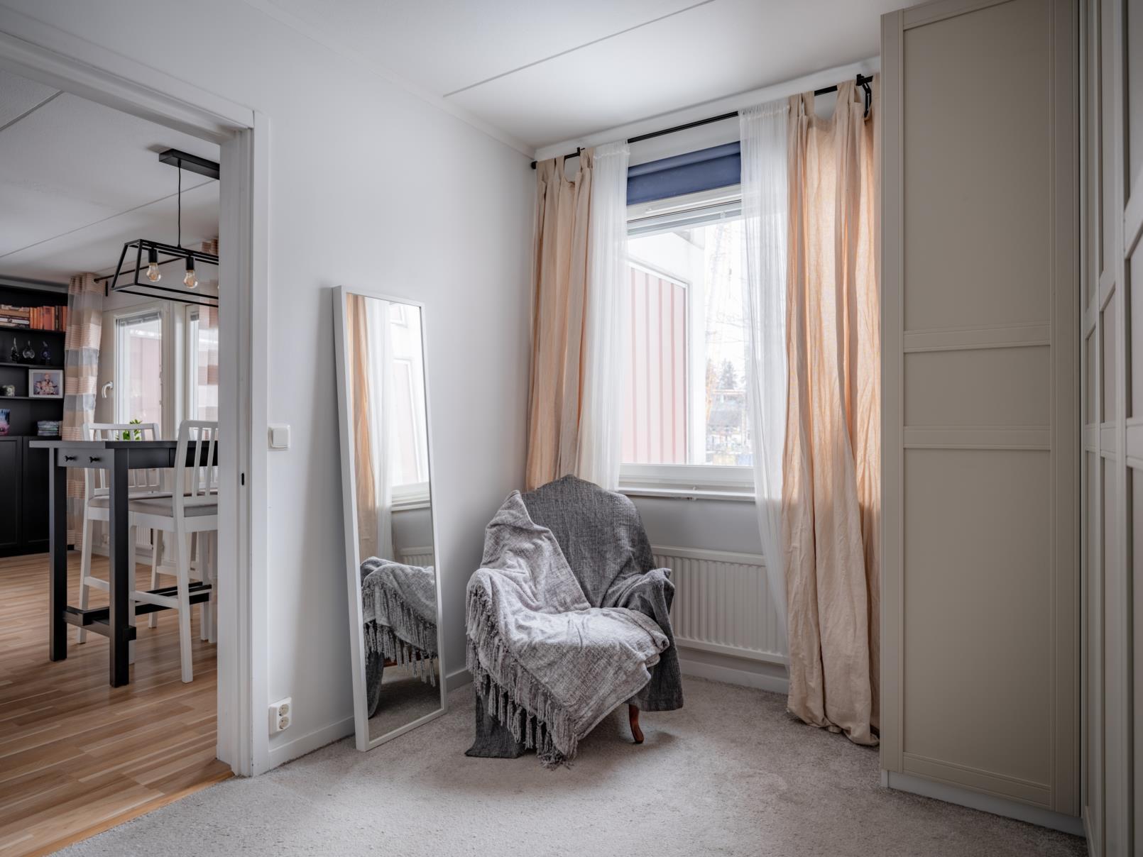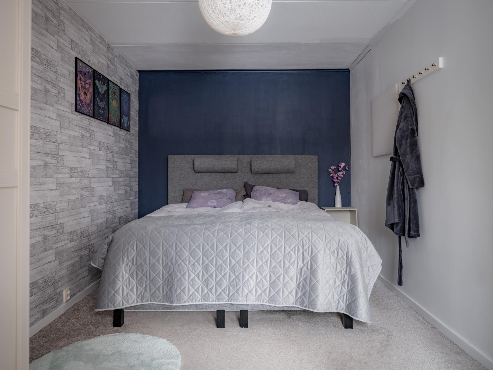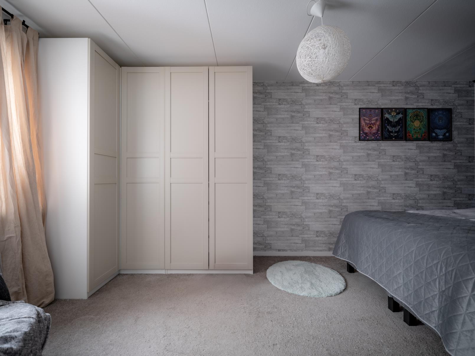Sovrum beläget intill köket. Beige heltäckningsmatta (2018), vitmålade väggar samt blå fondvägg och tapetserad fondvägg. Garderob samt uppdaterat golv och förvaring från 2018.