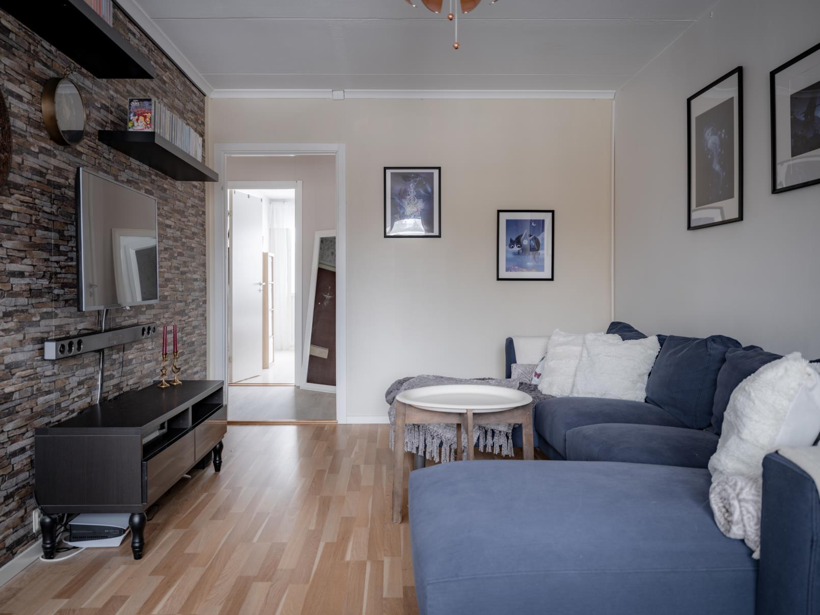 Generöst vardagsrum med samma laminatgolv som i köket. Väggar vitmålade och en vägg är målade i beige kulör samt tapetserad fondvägg. Här finns gott om plats för större soffgrupp och mediamöbel. Utgång till bostadens stora balkong i söderläge.