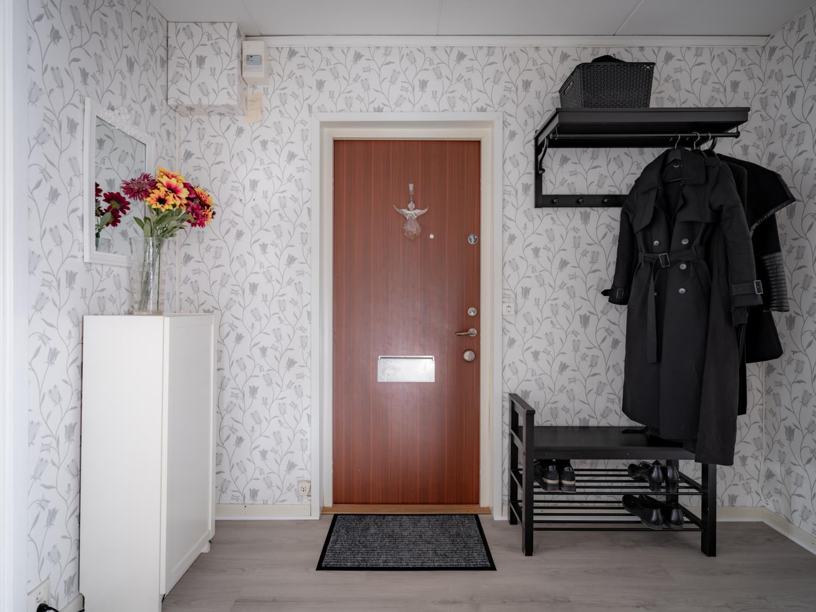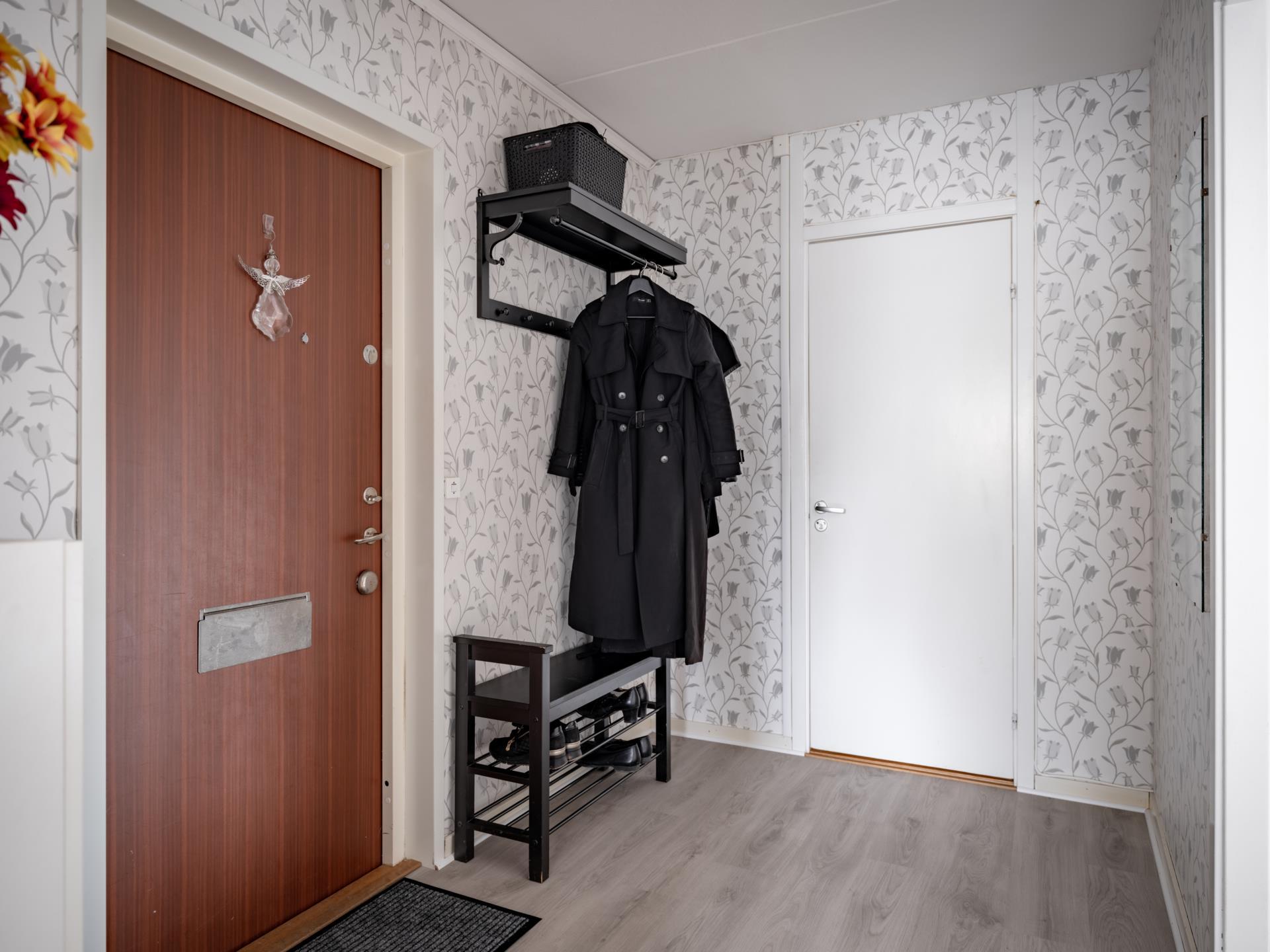 Välkomnande hall med ljust laminatgolv och tapetserade väggar. Här finns goda avhängningsmöjligheter samt plats för förvaringsmöbel. Lägenheten är belägen på våningsplan 2 av 3 och nås smidigt via hiss.