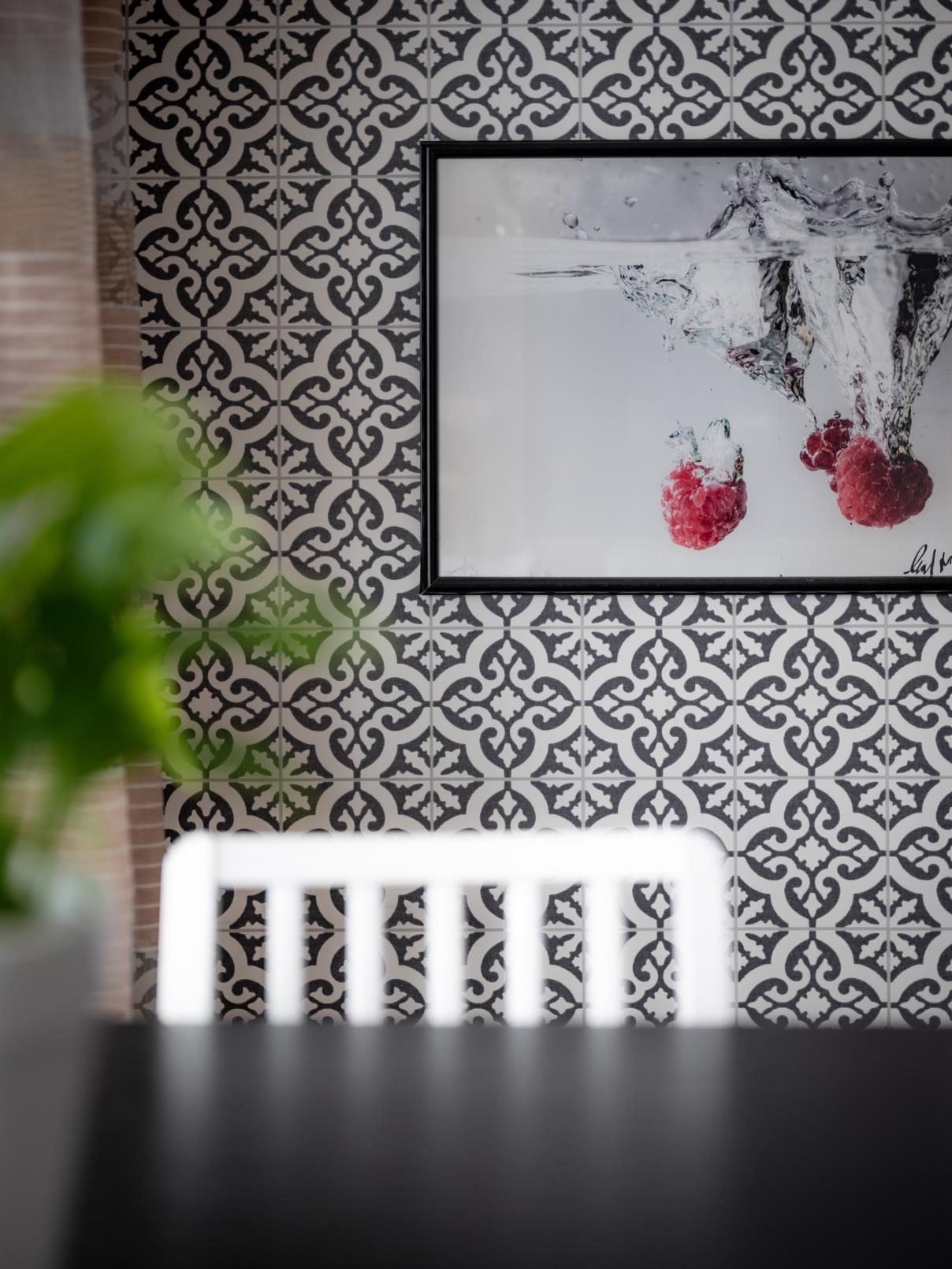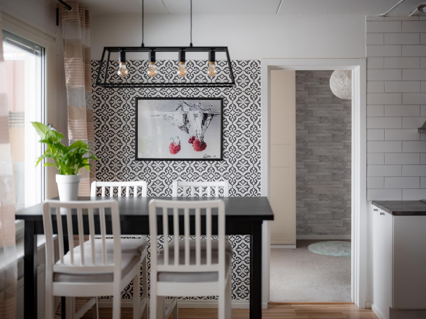 Stilrent kök med vita luckor, vitt liggande kakel och laminatbänkskiva. Utrustat med kyl/frys, spishäll, ugn, diskmaskin och fläkt i rostfritt utförande. Laminatgolv som löper vidare mot vardagsrummet skapar en enhetlig känsla. Matplats intill fönster med tapet i Marrakech-mönster och plats för 4–6 personer.