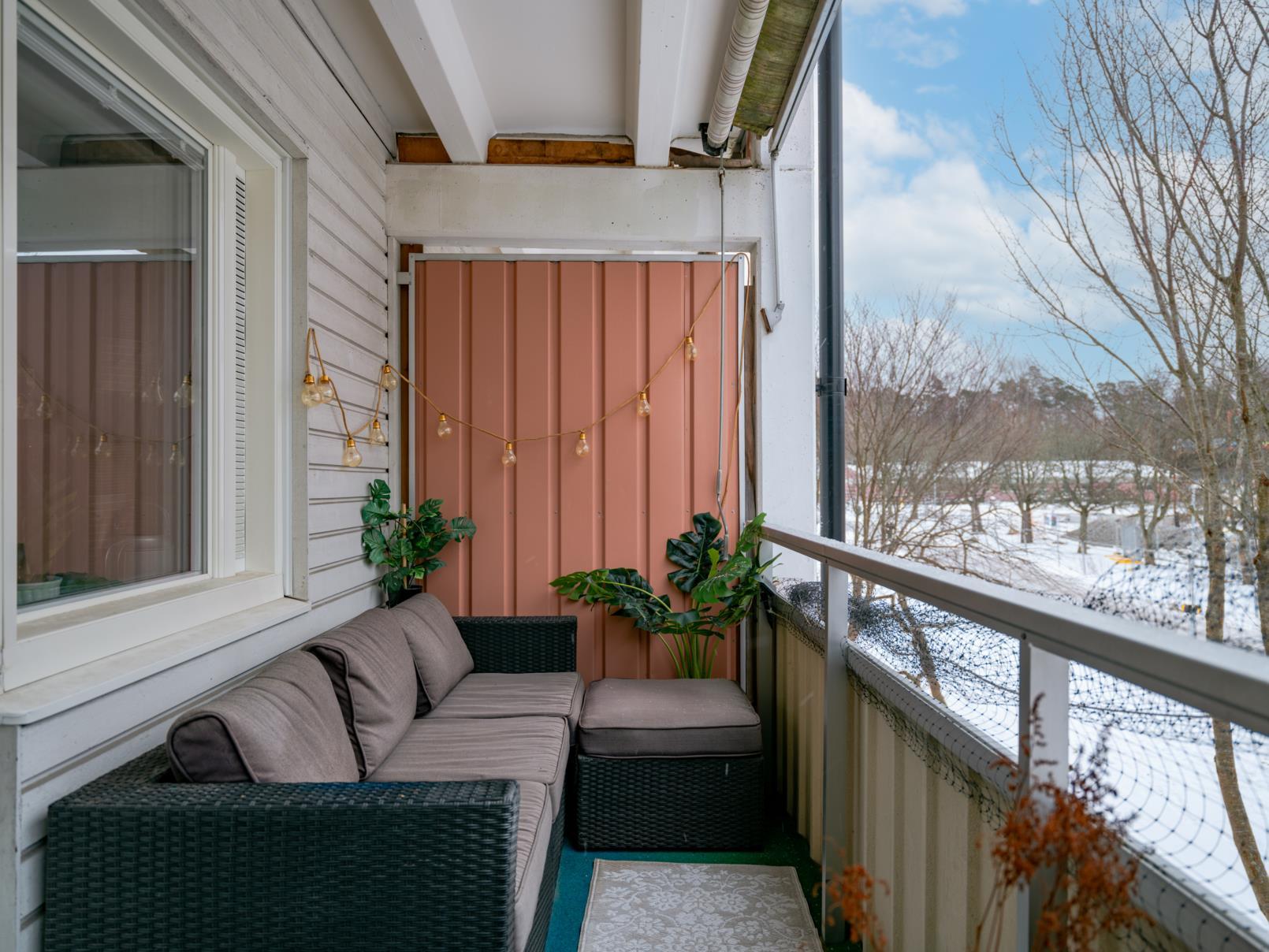 - BalkongJa. Bostadens stora balkong i soligt söderläge blir en naturlig förlängning av vardagsrummet under årets varmare månader. Här njuter du av många soltimmar och en trevlig utsikt över föreningens lugna innergård. Läget på våningsplan 2 av 3 ger ett insynsskyddat och trivsamt läge med fri känsla. Här finns gott om plats för utemöbler, växter och grill – en perfekt plats för både morgonkaffet och sommarkvällar med vänner och familj.