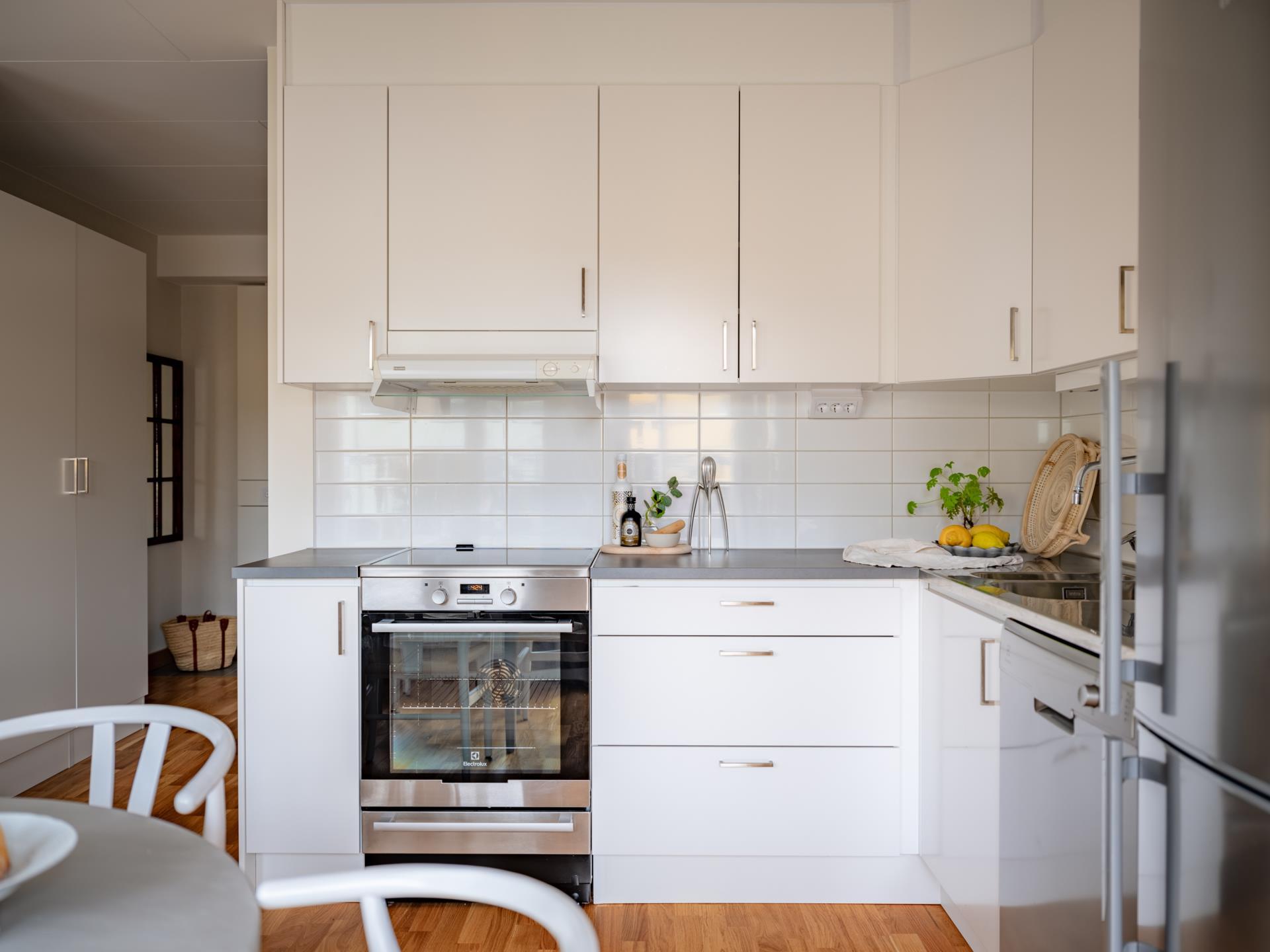 Stilrent och välplanerat kök med generösa arbetsytor och goda förvaringsmöjligheter. Här finns full maskinell utrustning i form av kyl/frys, spishäll med ugn, spisfläkt och diskmaskin. Intill köket finns en naturlig plats för matbord vid fönstret, och från köket når du balkongen i västerläge – perfekt för kvällssol och sommarens middagar utomhus.