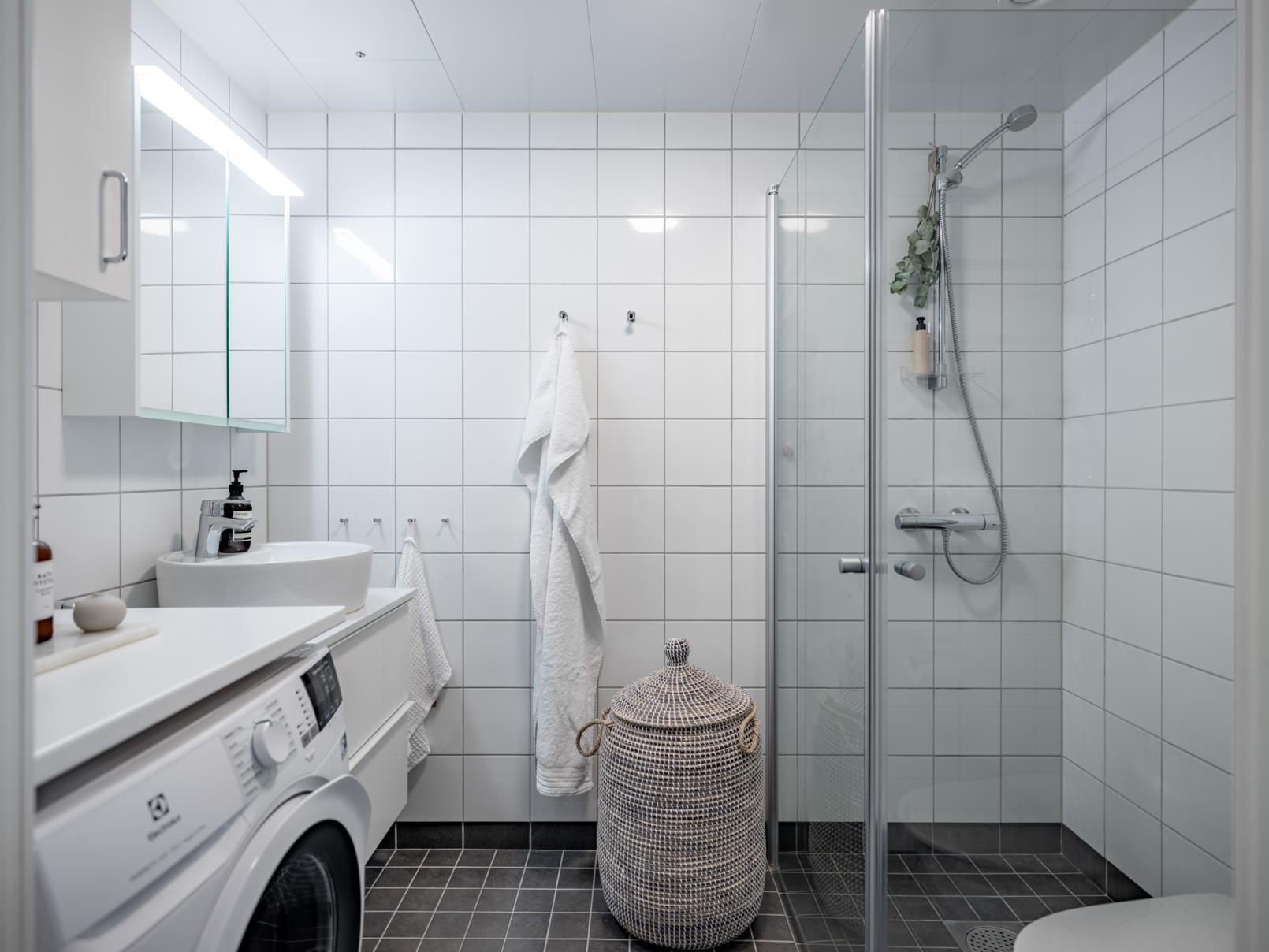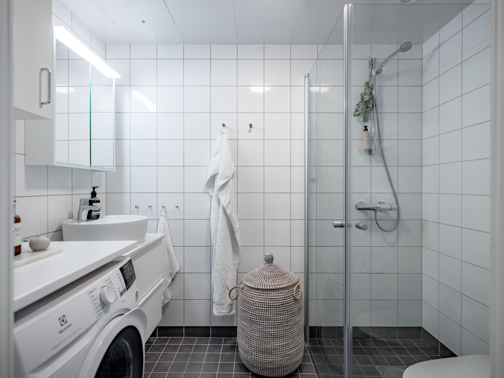Helkaklat badrum med vitkaklade väggar och mörkt klinkergolv. Utrustat med golvvärme, dusch med duschvägg, handfat med kommod, badrumsspegel med förvaring och kombinerad tvättmaskin/torktumlare. Här finns gott om förvaringsutrymme som förenklar vardagen.