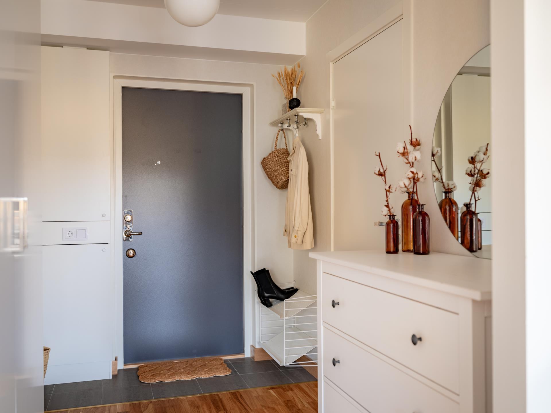 När du kliver in möts du av en inbjudande hall med gott om förvaring och smarta avhängningslösningar. Direkt intill ligger det helkaklade badrummet med mörkt klinkergolv, golvvärme och en praktisk kombinerad tvättmaskin/torktumlare. Här finns även en kommod som ger extra förvaringsutrymme och förenklar vardagen.