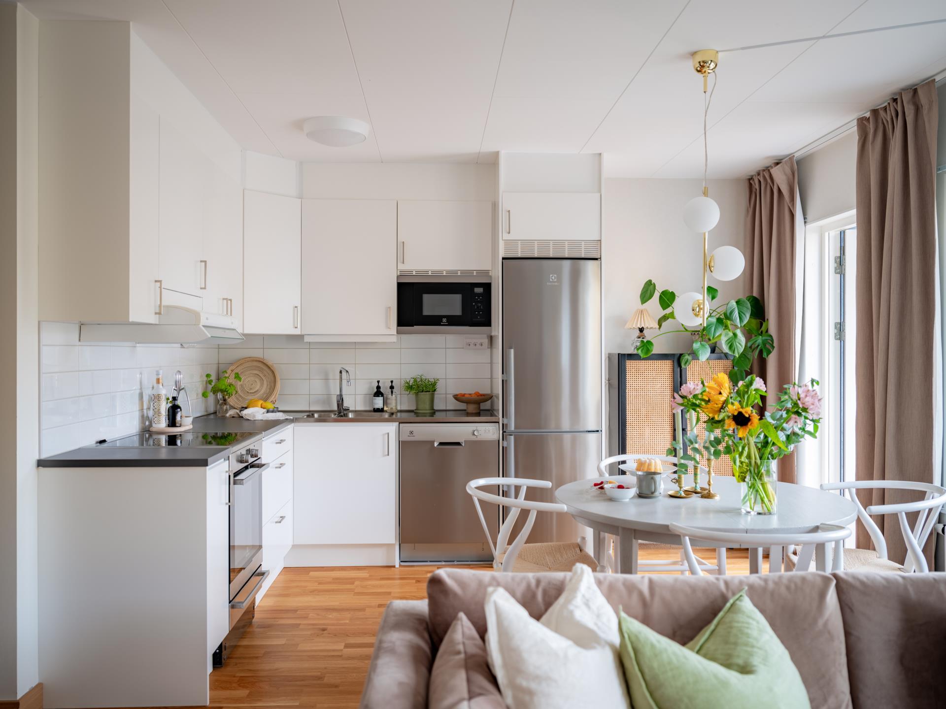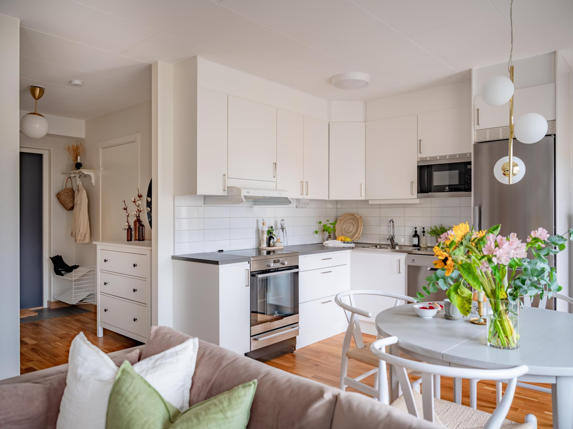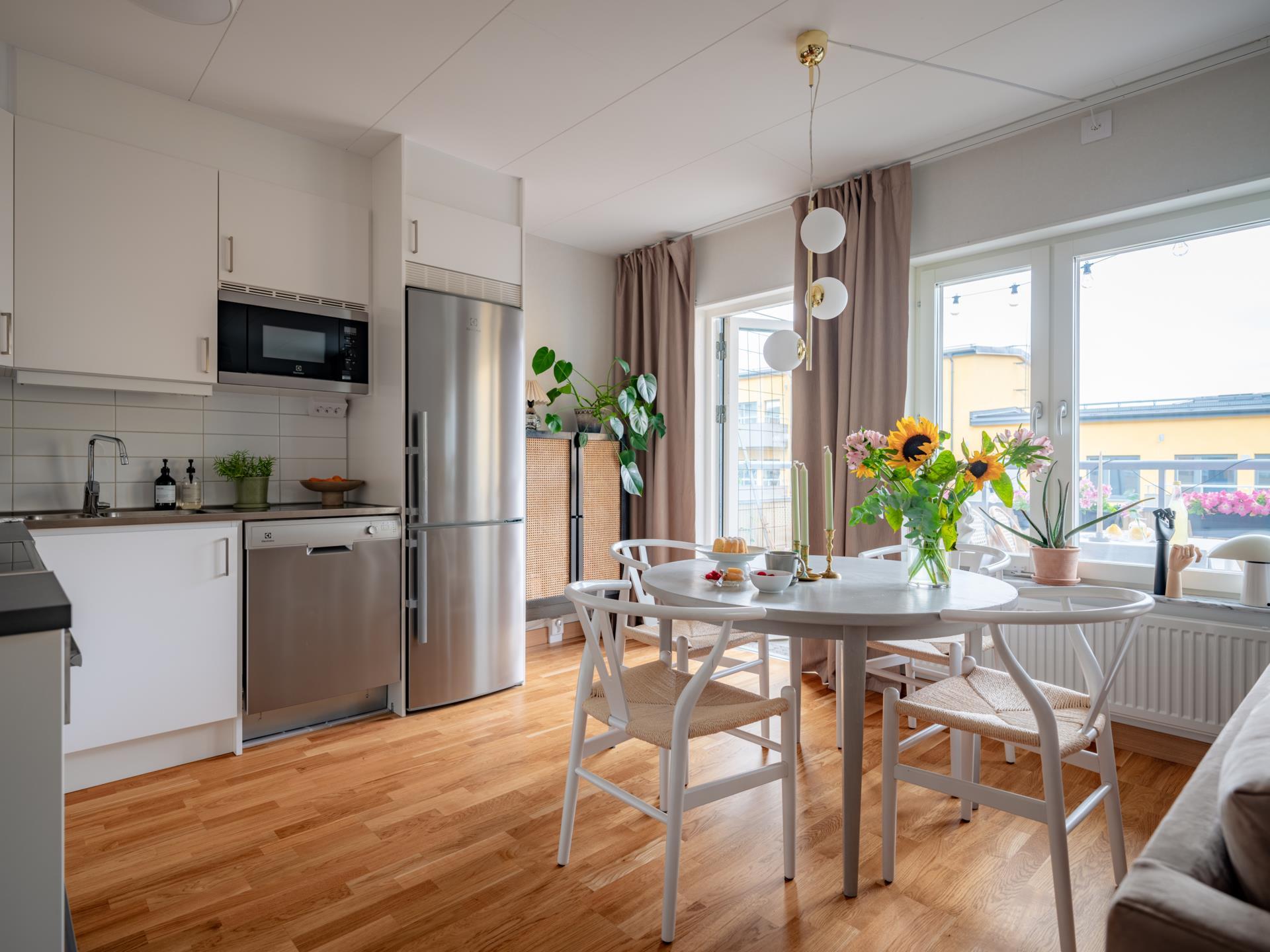 Bostadens hjärta är den öppna planlösningen mellan kök och matplats, där du hittar goda arbetsytor och praktisk förvaring. Här finns även en naturlig plats för matbord intill fönstret. Från köket nås balkongen i västerläge – perfekt för kvällssol, avkopplande stunder eller middagar ute under sommarens varma kvällar.