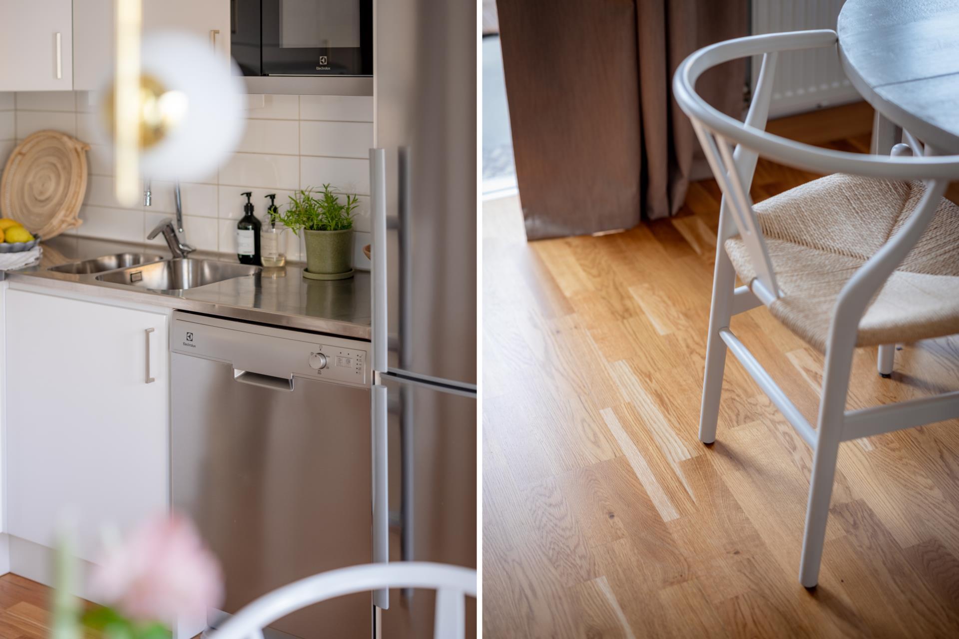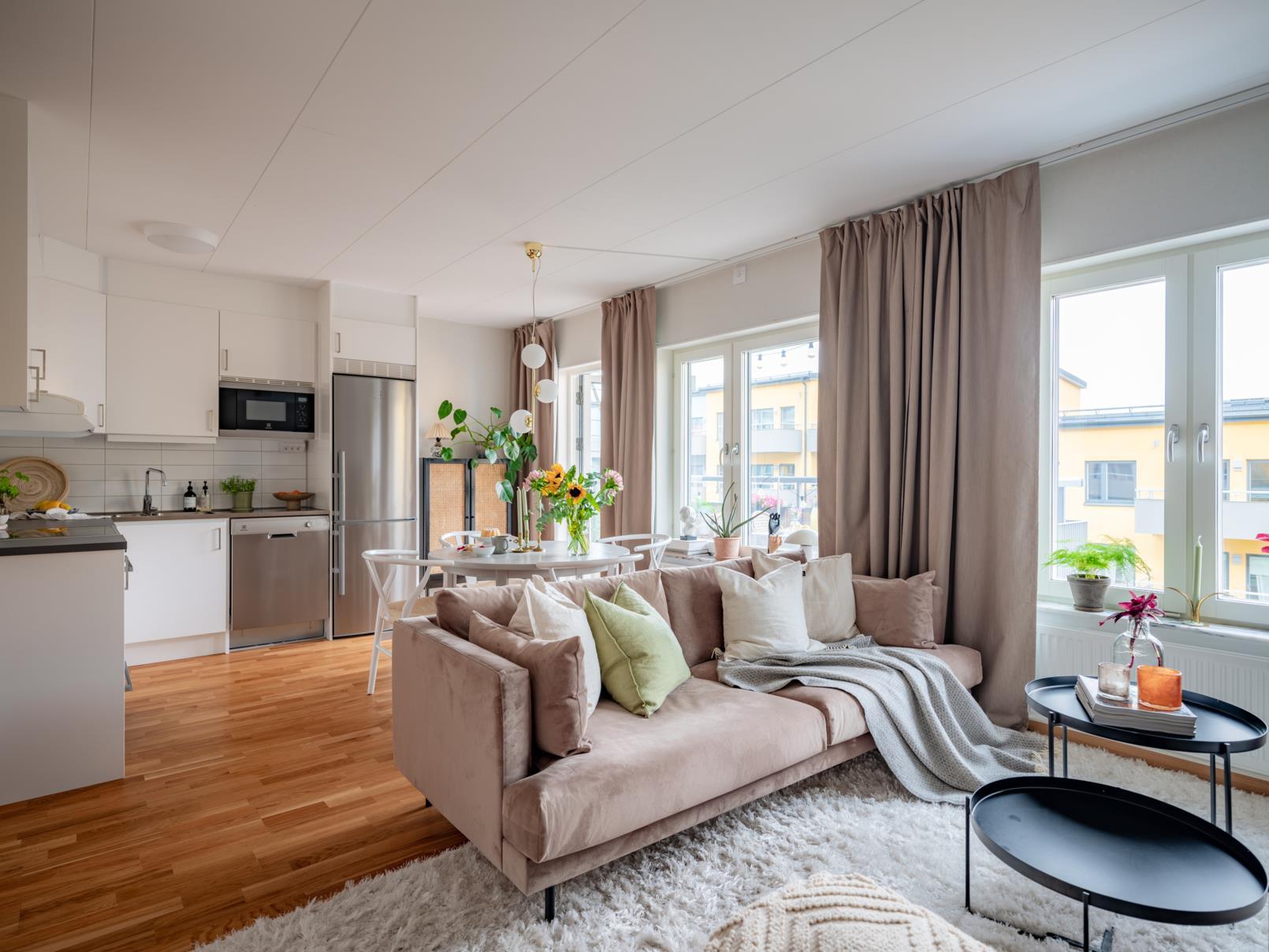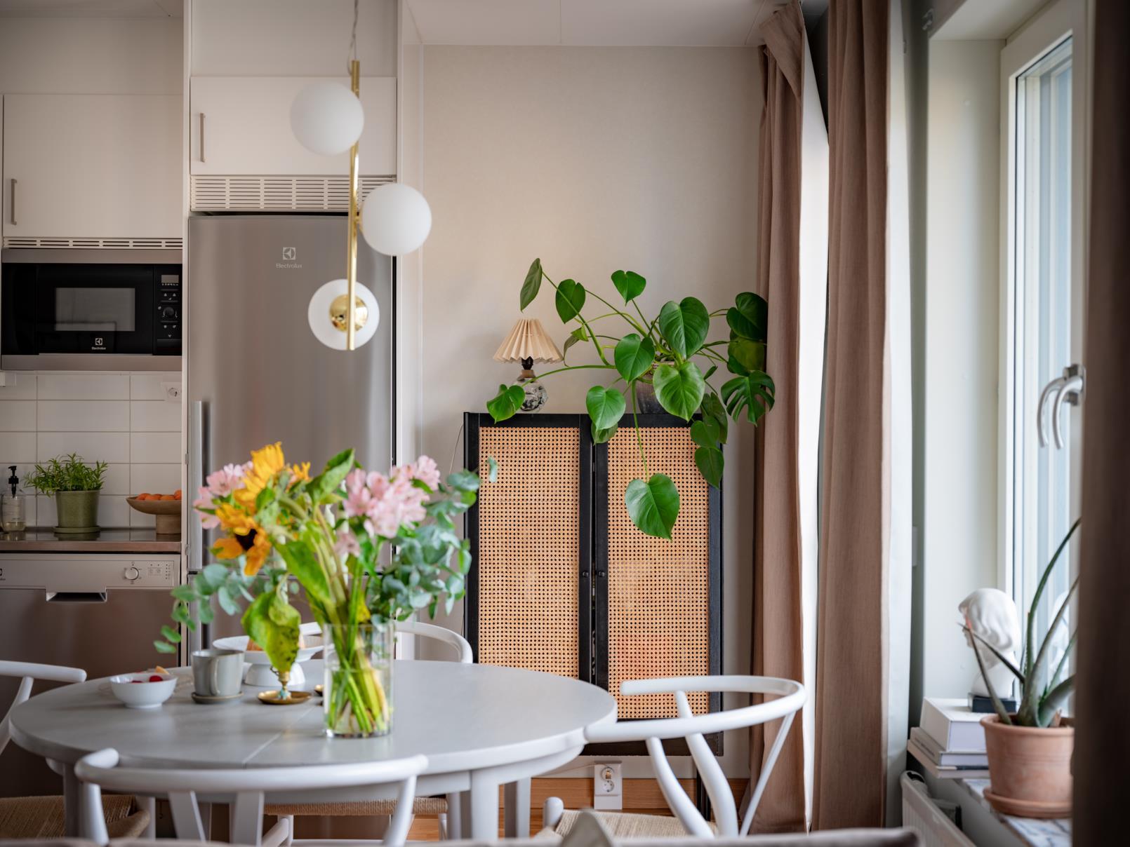 Bostadens hjärta är den öppna planlösningen mellan kök och matplats, där du hittar goda arbetsytor och praktisk förvaring. Här finns även en naturlig plats för matbord intill fönstret. Från köket nås balkongen i västerläge – perfekt för kvällssol, avkopplande stunder eller middagar ute under sommarens varma kvällar.