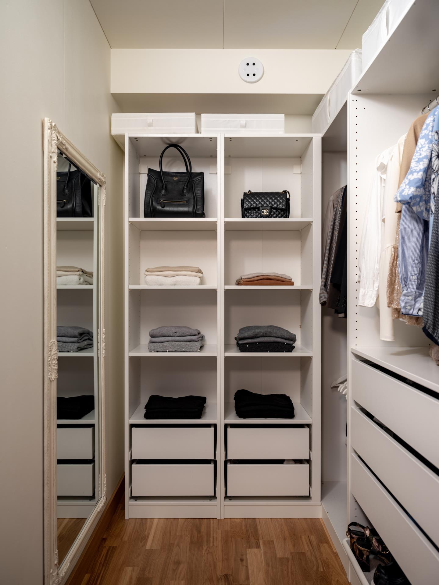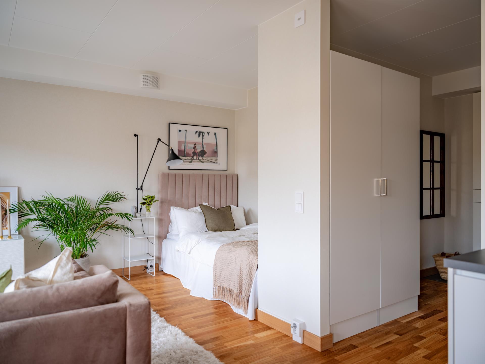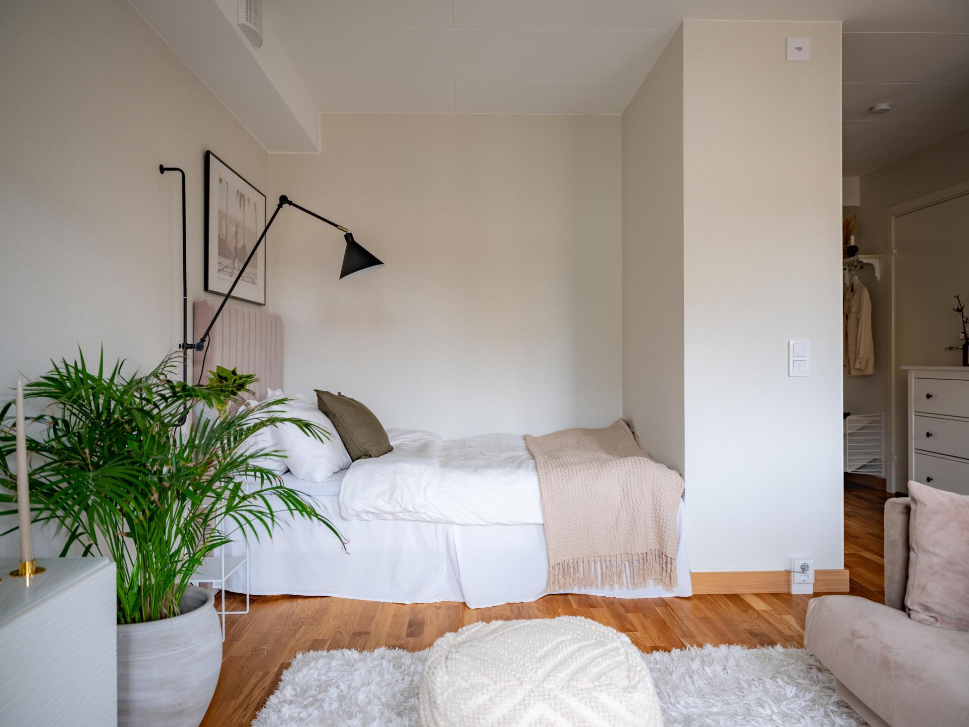 Vardagsrummet är lättmöblerat och skapar en harmonisk plats för soffhörna och TV-mys. Sovalkoven är smart placerad intill, vilket ger en avskild och rogivande plats för vila utan att kompromissa med känslan av rymd. Lägenheten har även gott om förvaringsmöjligheter i garderoberna i klädkammaren, vilket gör hemmet både praktiskt och lätt att hålla ordning i.