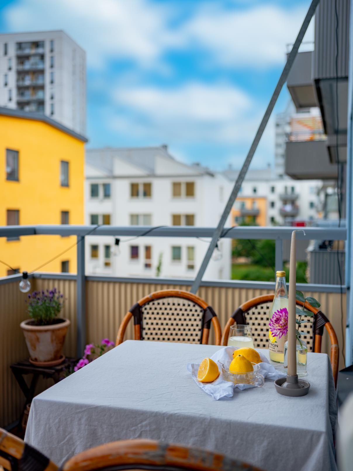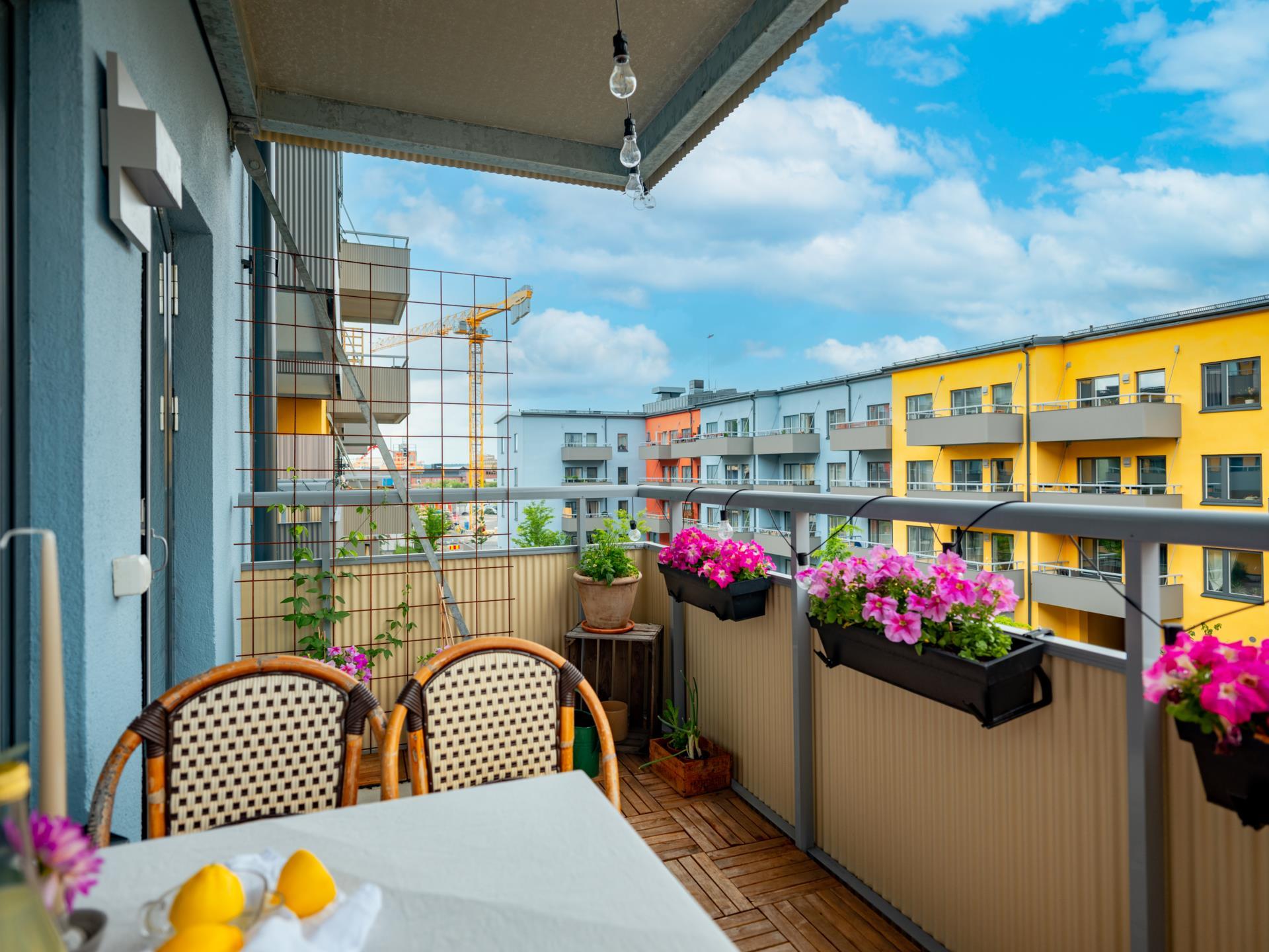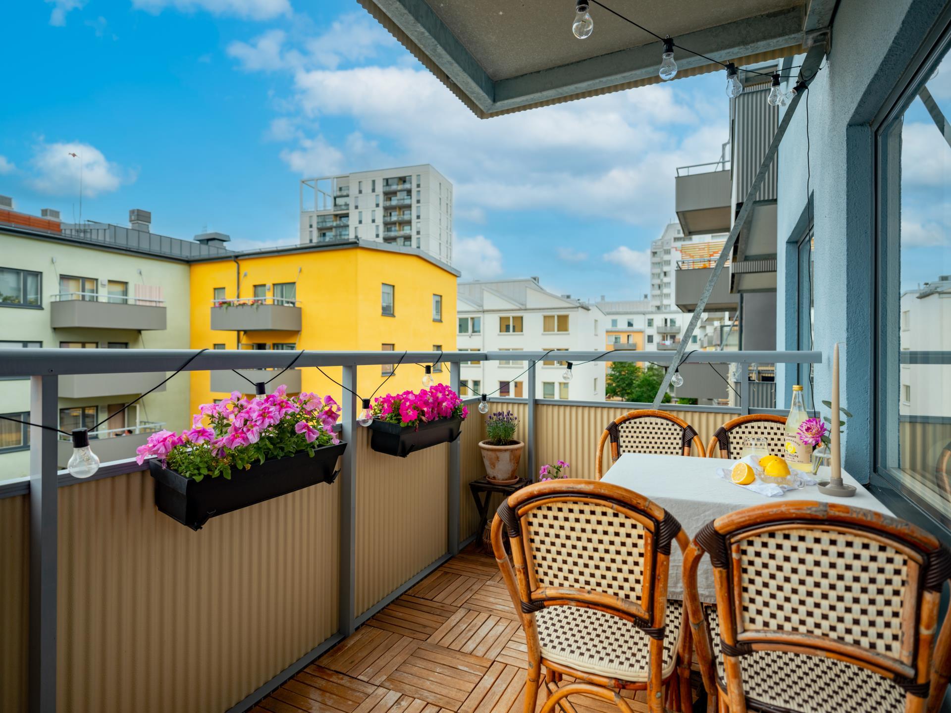 Rymlig balkong i västerläge med kvällssol. Här finns plats för loungemöbler, växter och blomlådor – en perfekt plats för avkoppling, sena sommarkvällar och middagar utomhus.