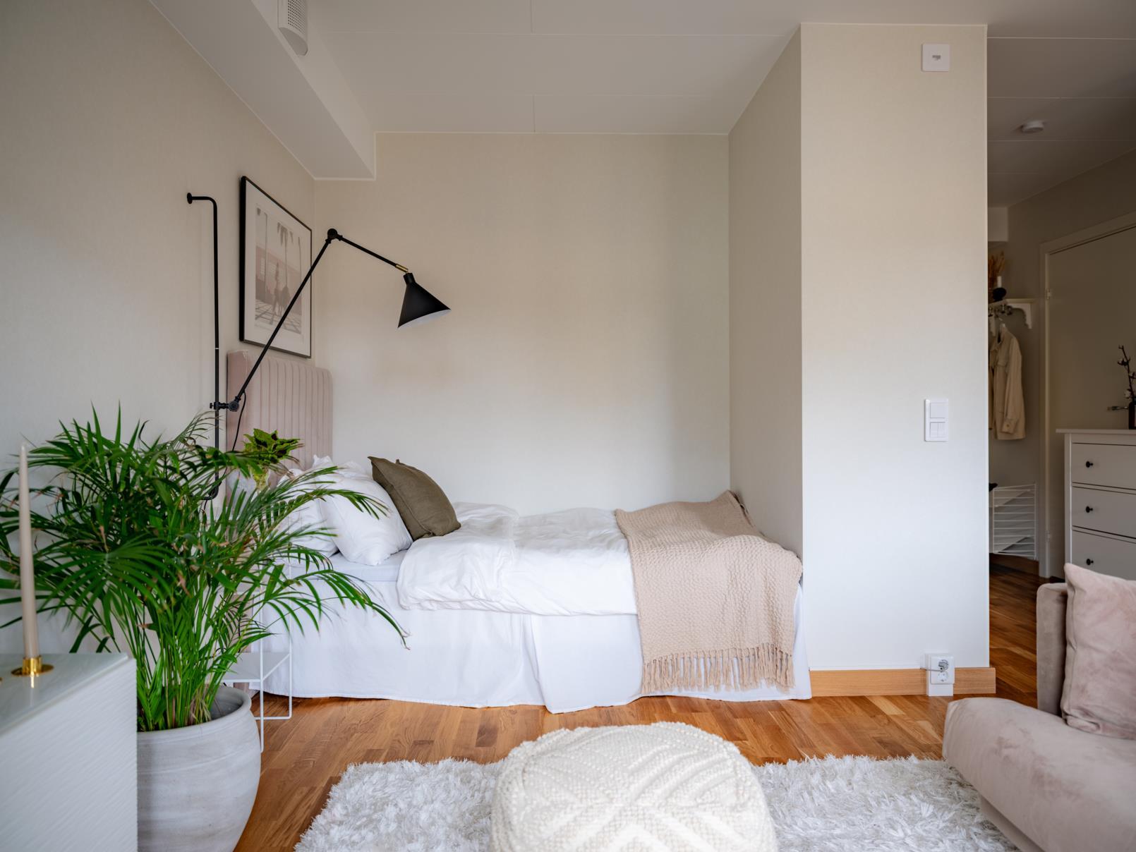 Smart placerad sovalkov med avskild plats för säng och nattduksbord. Lösningen gör att bostadens sociala ytor kan nyttjas fullt ut samtidigt som du får en rogivande plats för vila.