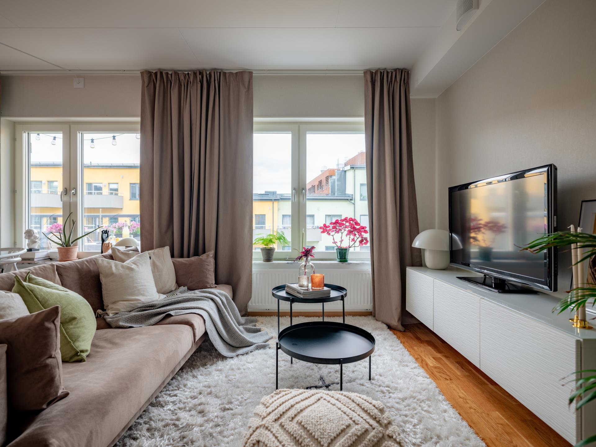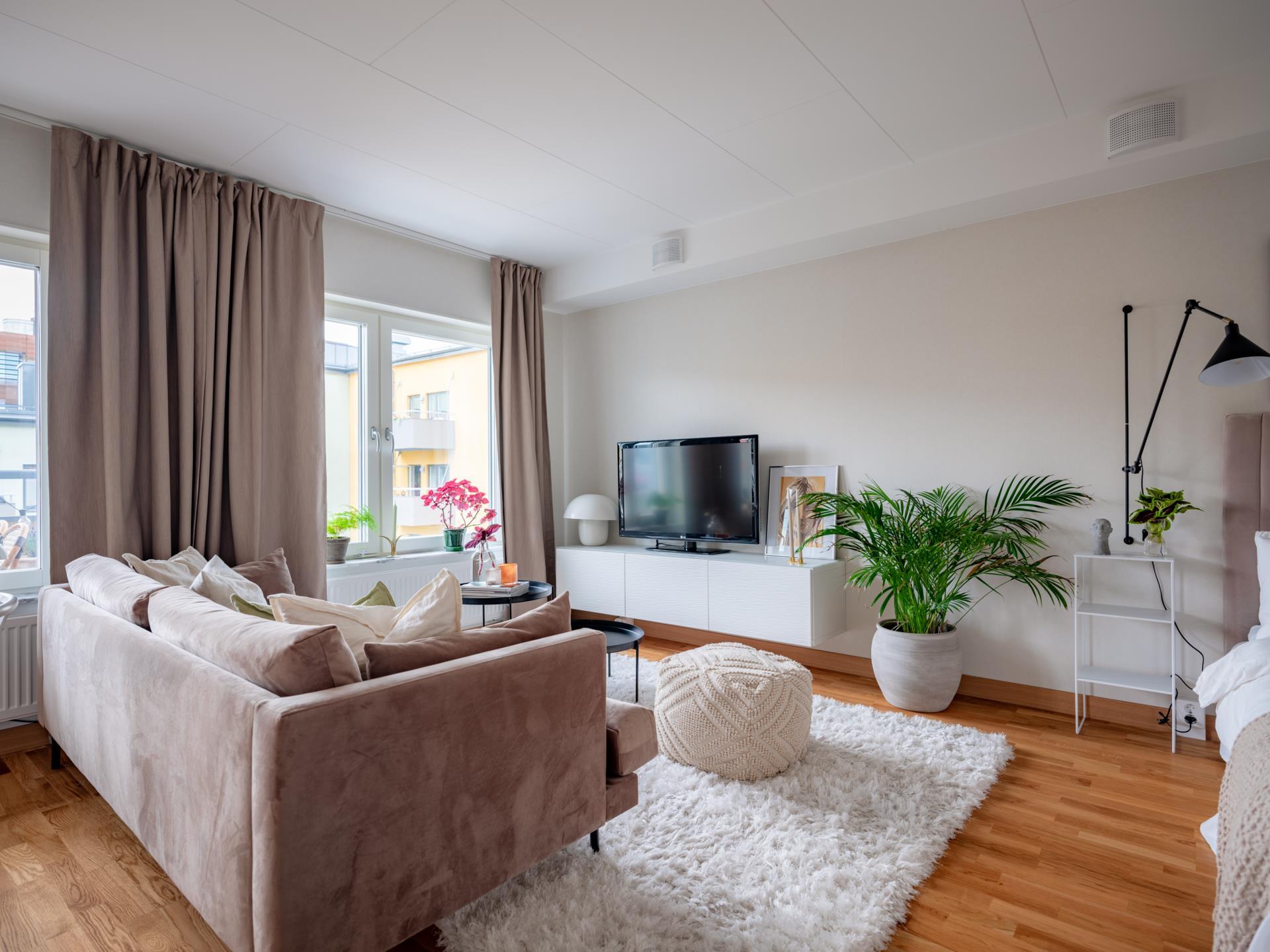 Lättmöblerat vardagsrum som rymmer både soffhörna och mediamöbel. Rummet ligger i anslutning till sovalkoven och skapar tillsammans med den smarta planlösningen ett luftigt och socialt hem.
