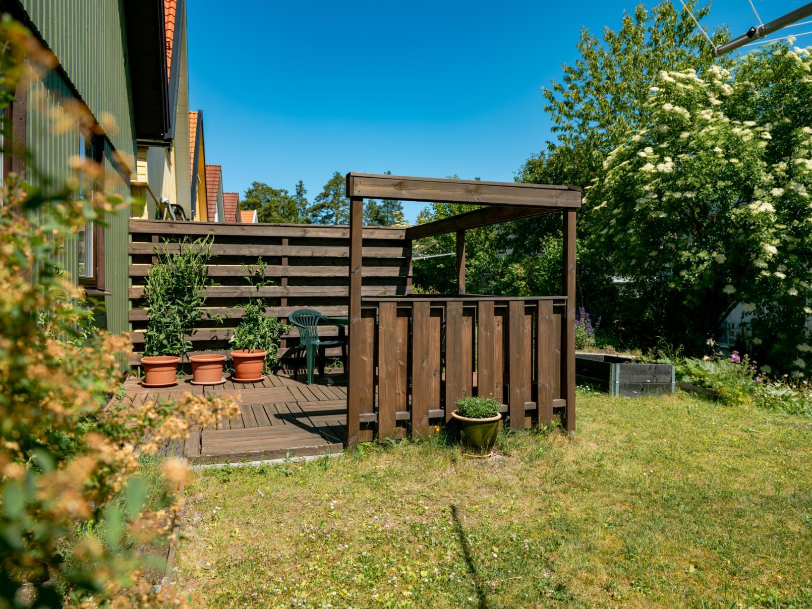 Utomhus väntar en grönskande trädgård med odlingslådor och rabatter för dig med gröna fingrar – samt två uteplatser som fångar sol från olika håll under dagen. Ett förråd i direkt anslutning till garaget ger dessutom extra plats för allt från trädgårdsverktyg till cyklar.