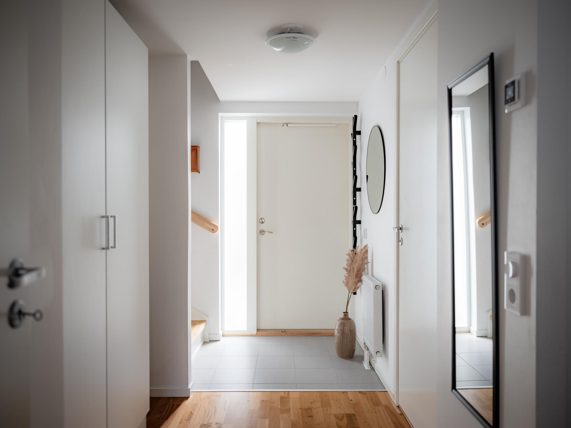 En ljus och välkomnande entré som sätter tonen för resten av bostaden. Klinkergolv möter ljusa väggar och skapar ett stilrent första intryck. Här finns två garderober och mediacentral samt gott om plats för avhängning – en praktisk och genomtänkt start på hemmet.