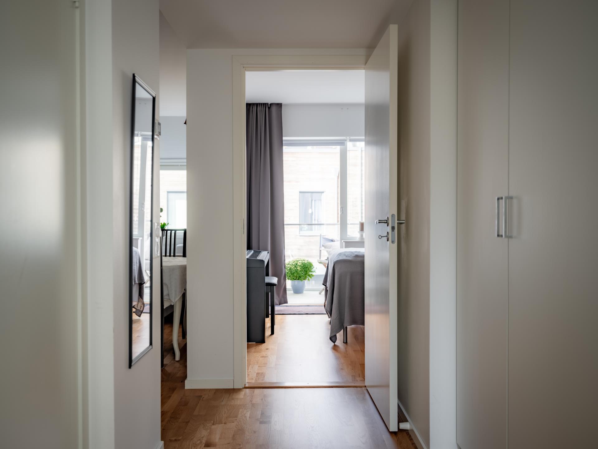 På entréplanet finns även ett rofyllt sovrum med utgång till balkongen – en perfekt plats för morgonkaffet i solen eller en stilla stund i kvällsljuset. Här finns även ett generöst, helkaklat badrum med golvvärme och egen tvättdel – praktiskt och bekvämt i vardagen.