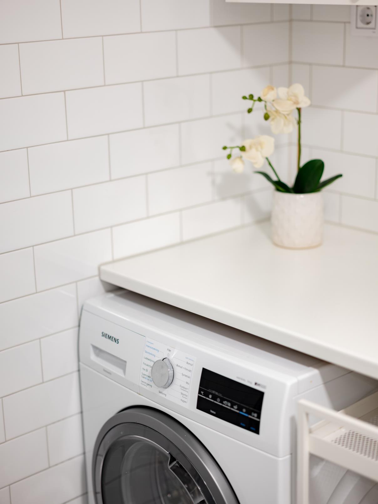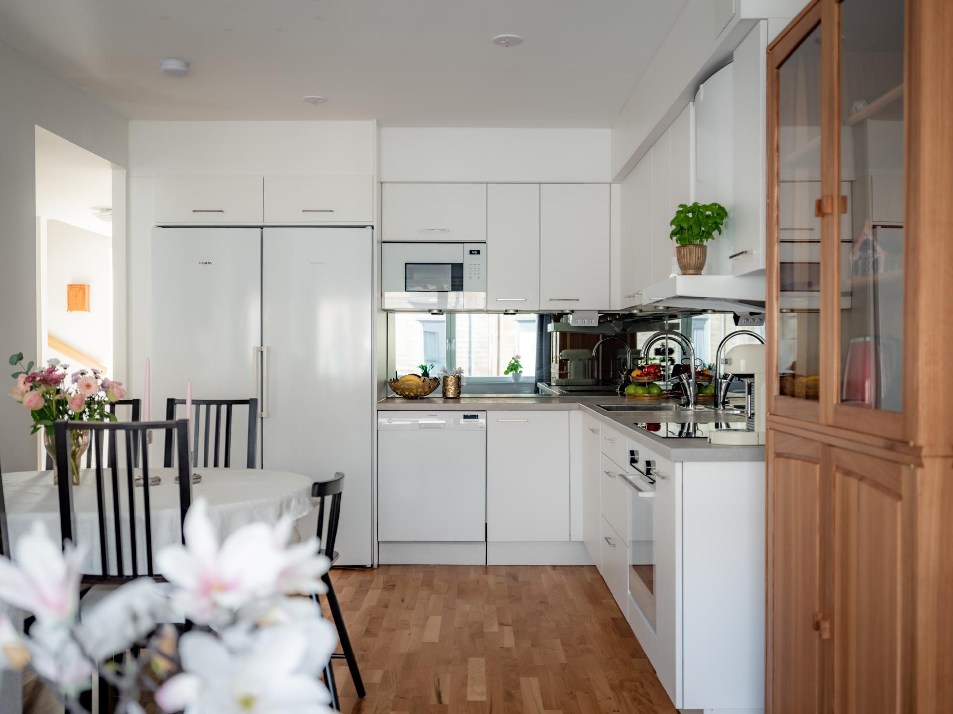 Köket är både stilrent och funktionellt – vita släta luckor från Vedum, vitvaror från Siemens och gott om arbetsyta gör det till en plats där både vardagsmiddagar och festliga bjudningar får ta plats. Spegelstänkskyddet reflekterar ljuset och förstärker rummets djup, medan vardagsrummet intill bjuder in till långa kvällar i goda vänners lag.