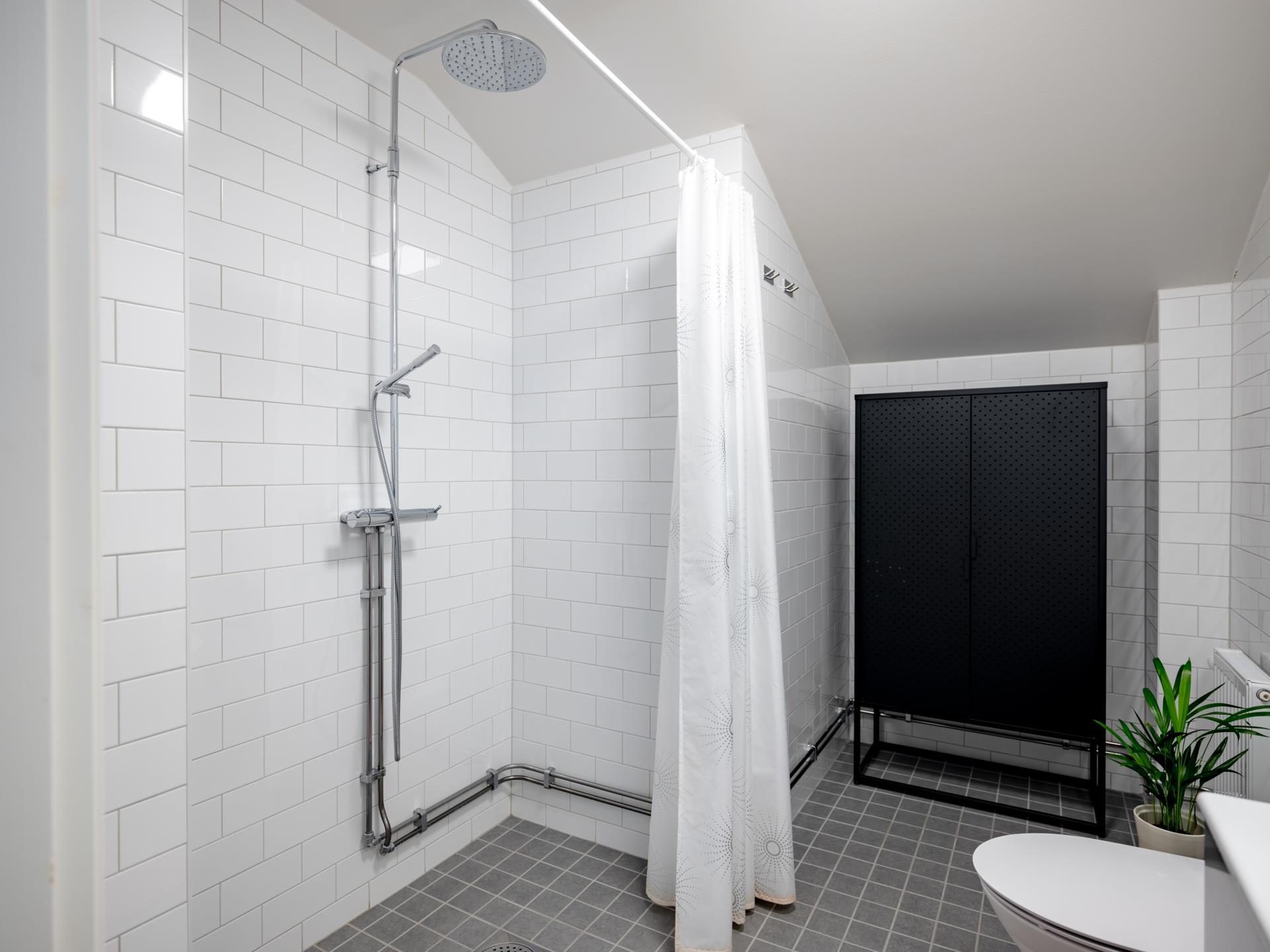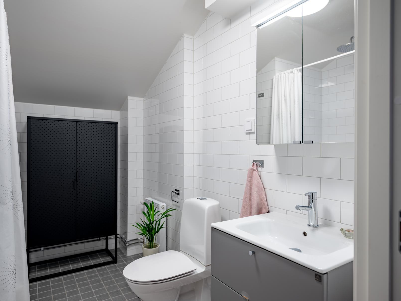 Helkaklat badrum på övre plan med klinkergolv, golvvärme och kaklade väggar. Utrustat med dusch med takdusch, wc, handfat med kommod och spegelskåp. Ett stilrent och funktionellt badrum som kompletterar övervåningen på bästa sätt.