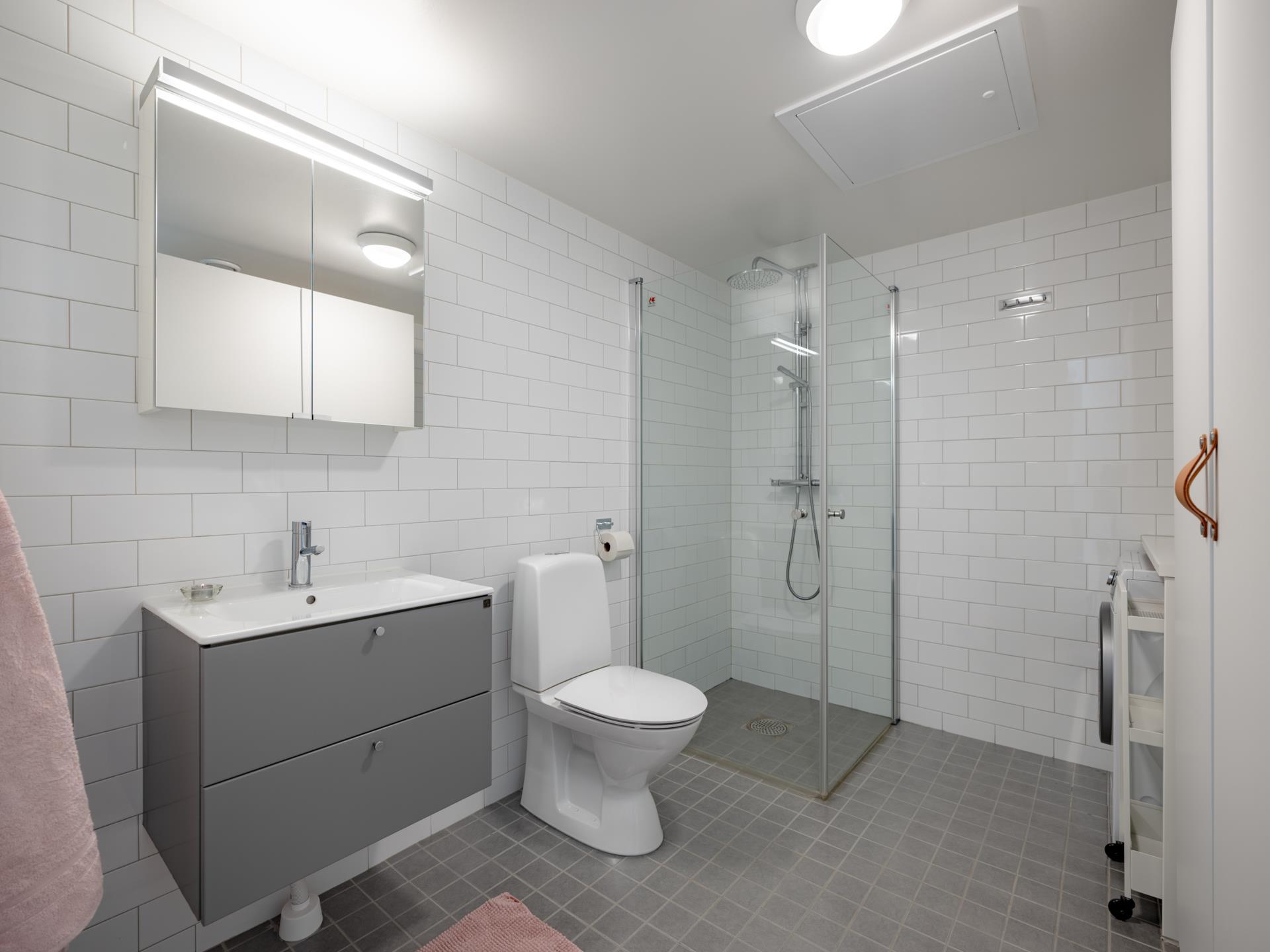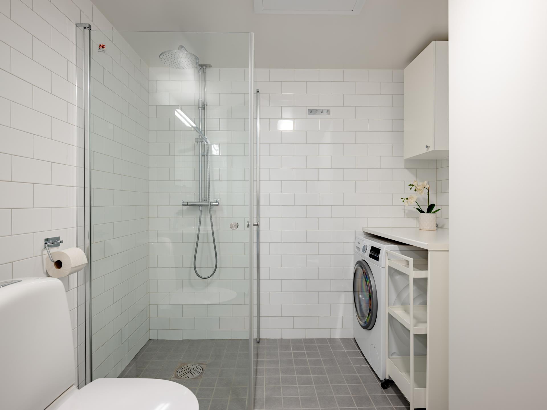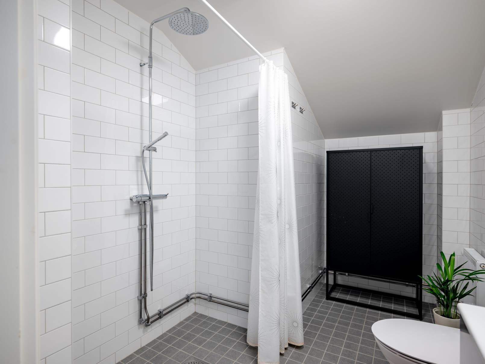 Generöst helkaklat badrum med klinkergolv och golvvärme som ger en behaglig komfort. Här finns duschhörna med glasdörrar, wc, handfat med kommod och spegelskåp. Kombinerad tvättmaskin och torktumlare samt extra förvaring gör vardagen smidig. Här finns städskåp.