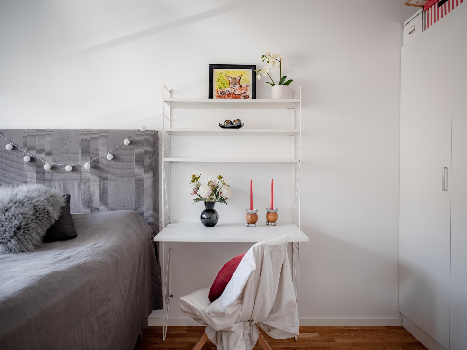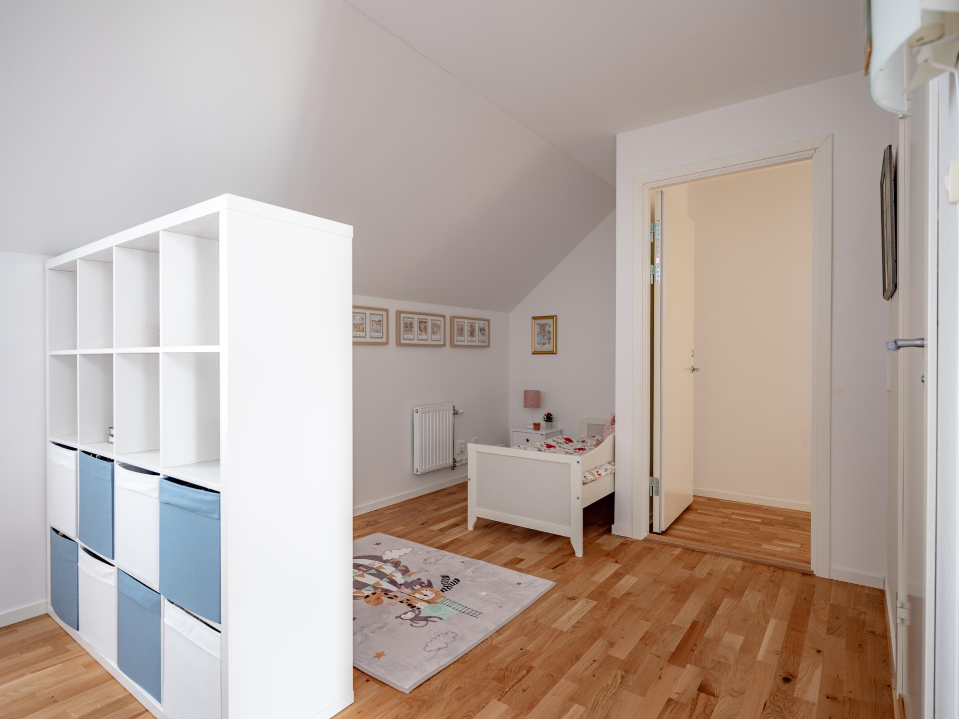 På övre plan möts du av ett flexibelt och trivsamt rum med parkettgolv och ljusa väggar. Idag är ytan smart avdelad med en högre möbel för att skapa två separata sovdelar – perfekt för syskon, hemmakontor eller kombinerat allrum och sovrum. Fönster i takkupa ger ett mjukt ljusinsläpp och en ombonad känsla.