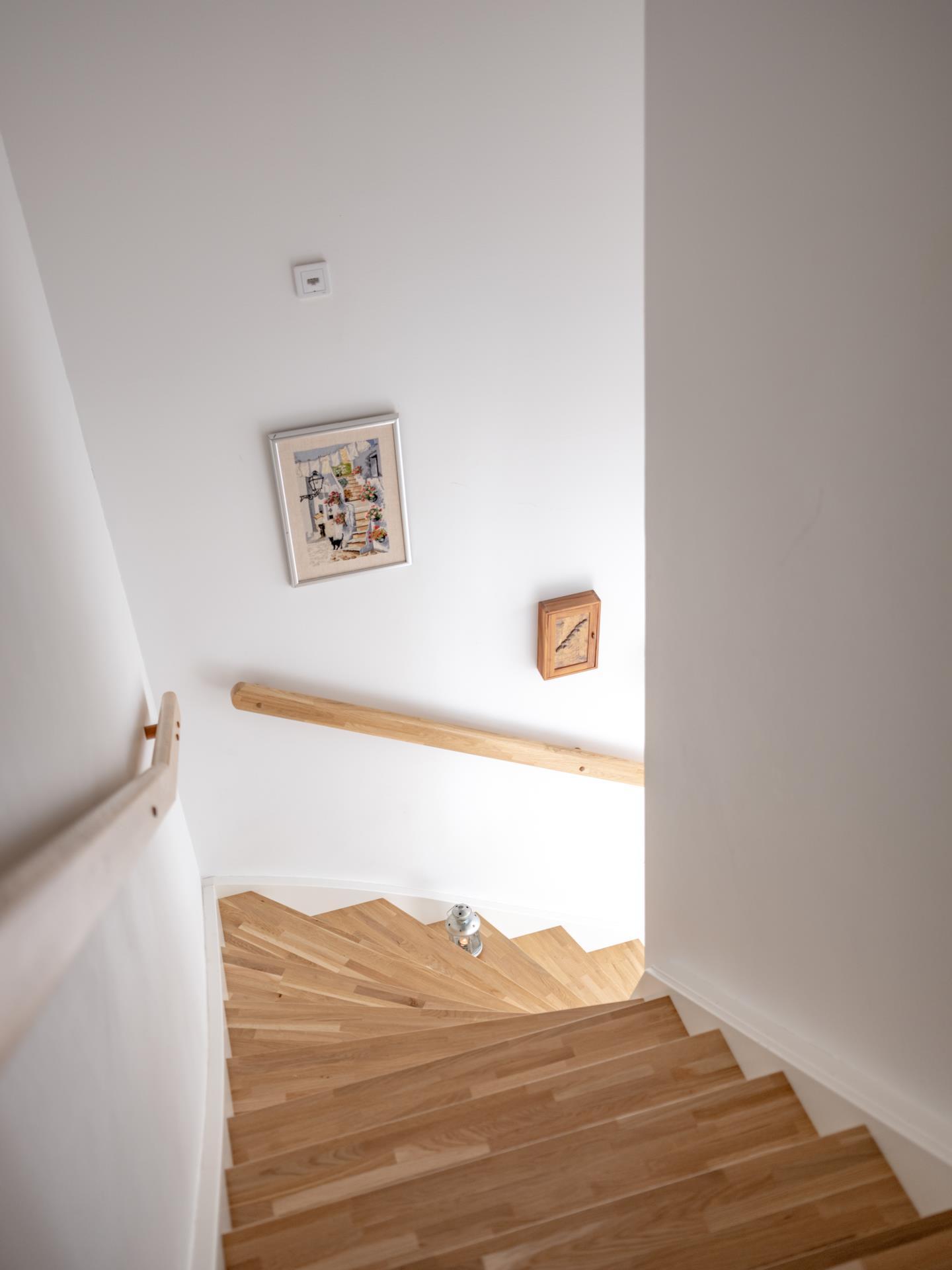 En trappa upp öppnar sig den mer privata sfären. Här finns två rymliga sovrum och ytterligare ett helkaklat badrum – en idealisk planlösning för barnfamiljen, tonåringen som vill ha sin egen våning eller för dig som behöver hemmakontor och gästrum. Ljuset från takkupan skapar en mjuk och ombonad atmosfär som gör övervåningen både trivsam och harmonisk.