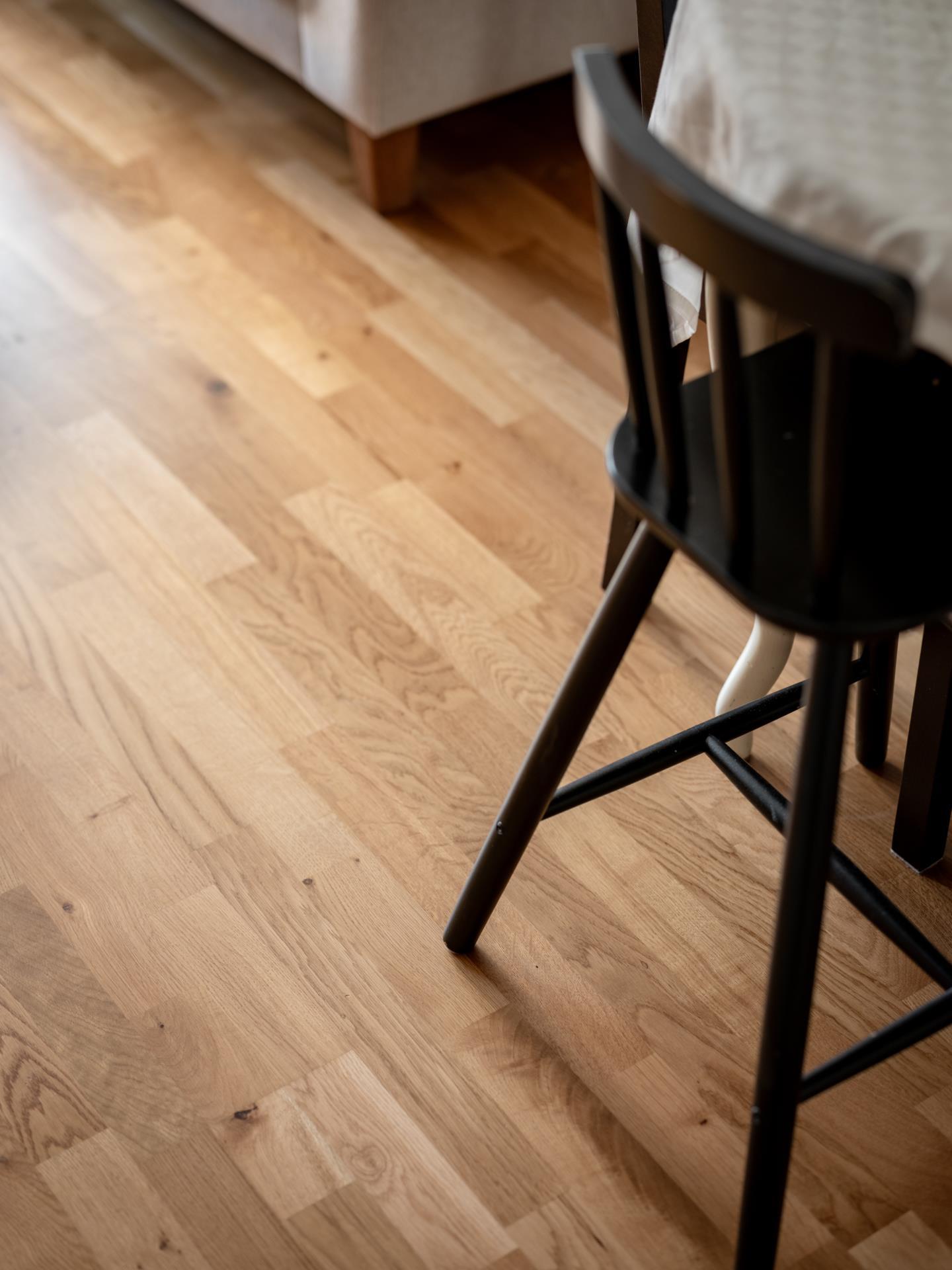 Ett ljust och luftigt vardagsrum med parkettgolv och stora fönsterpartier som släpper in rikligt med dagsljus. Här finns gott om plats för både soffgrupp och matbord. En varm och social miljö där vardag möter fest och där familj och vänner gärna samlas.