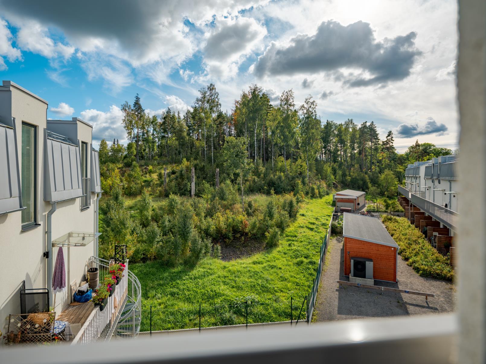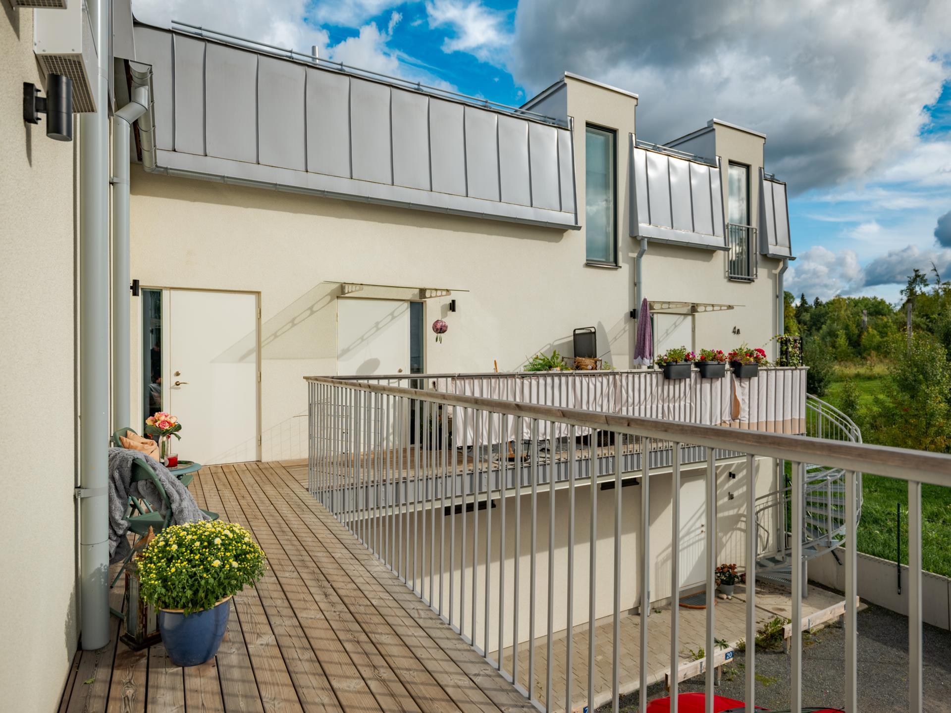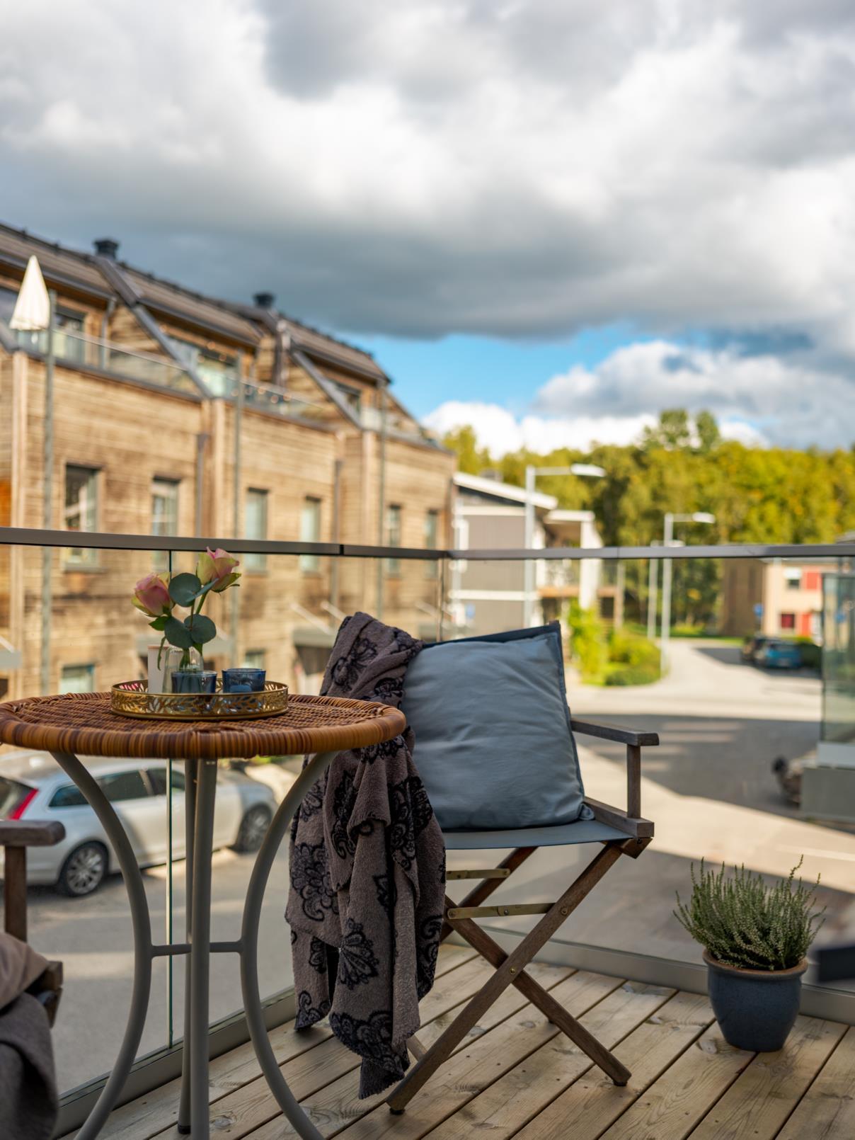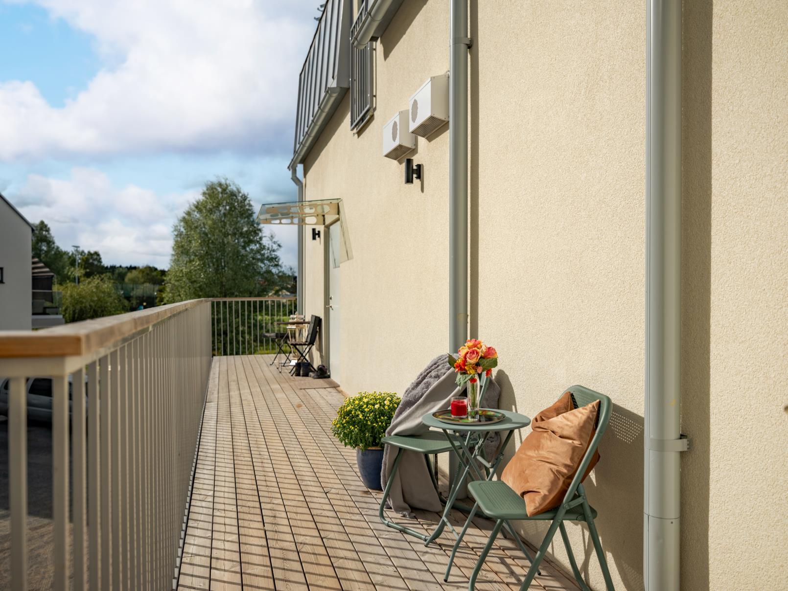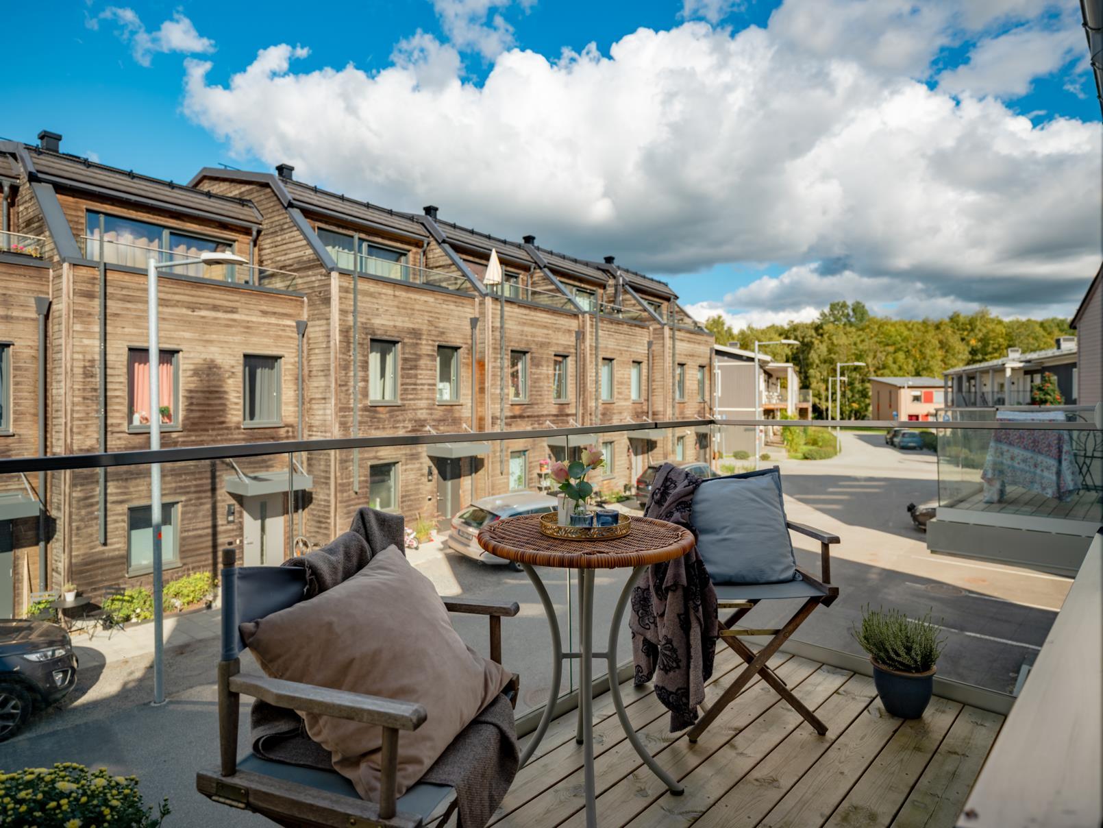 - BalkongJa. Balkongen blir en trivsam förlängning av bostaden och en naturlig plats för morgonkaffet eller en stunds avkoppling i frisk luft. Här får du sol både en stund på morgonen och en stund på kvällen, vilket ger fina ljusinslag över dagen och skapar en levande atmosfär. Grannhusen ger viss skuggning mitt på dagen, vilket samtidigt bidrar till en mer behaglig temperatur under sommarens varmaste timmar – en skyddad och sval plats att koppla av på. För större sällskap eller grillkvällar finns dessutom en gemensam grillplats på den mysiga innergården – en uppskattad samlingspunkt där grannar möts och sommarkvällarna får ta plats.
