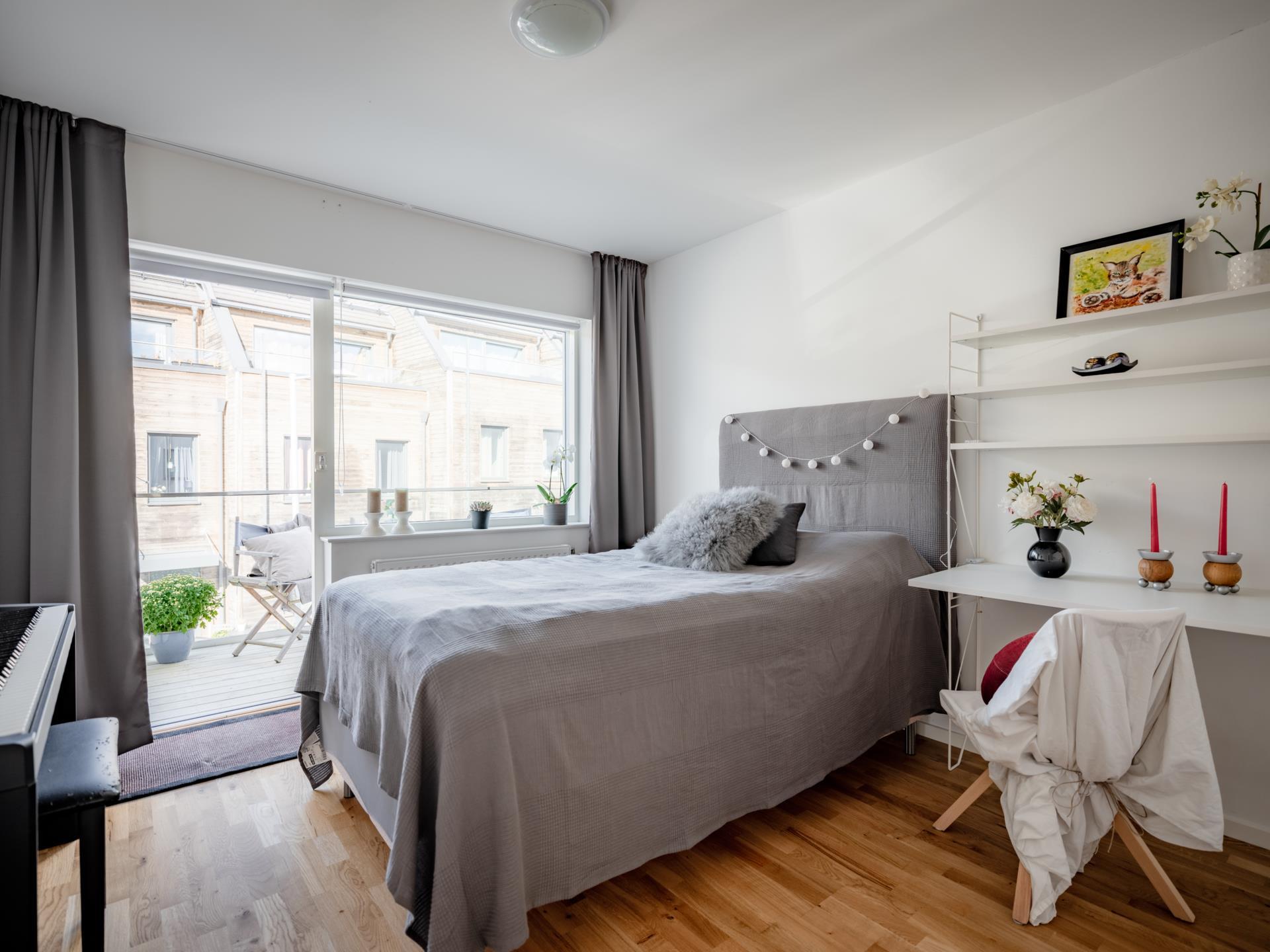Ett harmoniskt sovrum på entréplanet med plats för dubbelsäng och god förvaring i tre garderober. Utgången till balkongen förstärker känslan av ljus och rymd och skapar en härlig koppling mellan inne och ute.