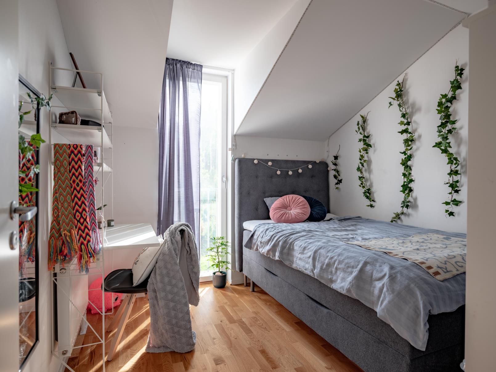 Ett rogivande sovrum med parkettgolv och ljusa väggar. Takkupan släpper in fint ljus och bjuder på utsikt mot grönska. Ett perfekt rum för barn, gäster eller arbete i hemmamiljö.