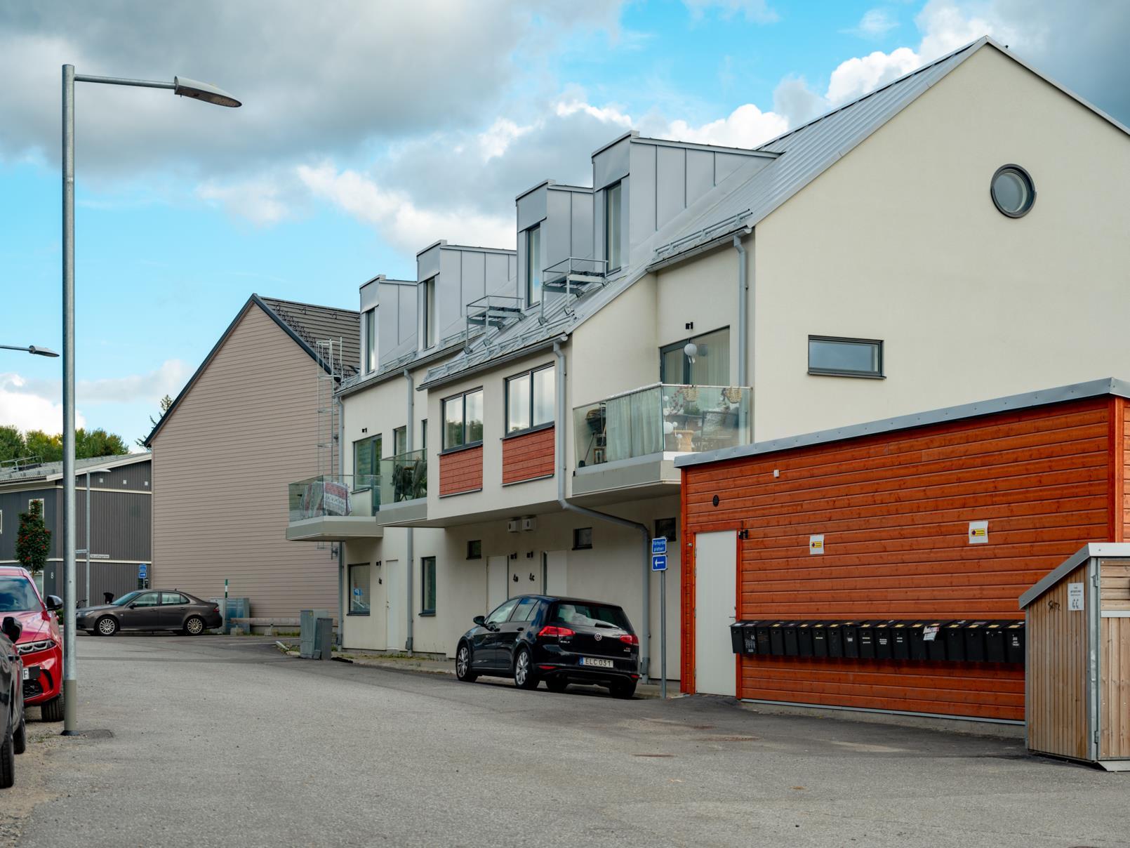 Till bostaden hör ett eget utomhusförråd och parkeringsplats kan hyras för 350 kr/mån. I dagsläget är det oklart om och när elladdstolpe kan komma att installeras. Fastigheten är ansluten till fiber.