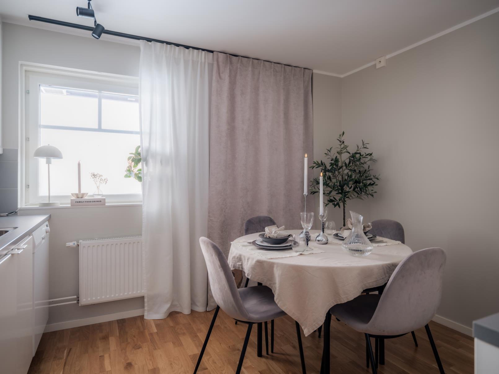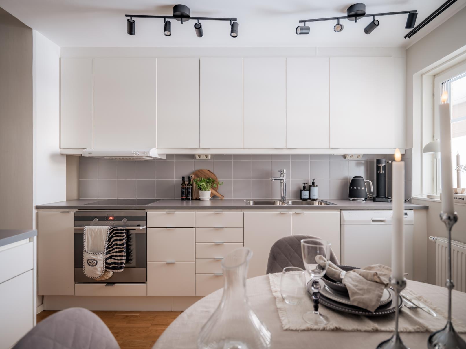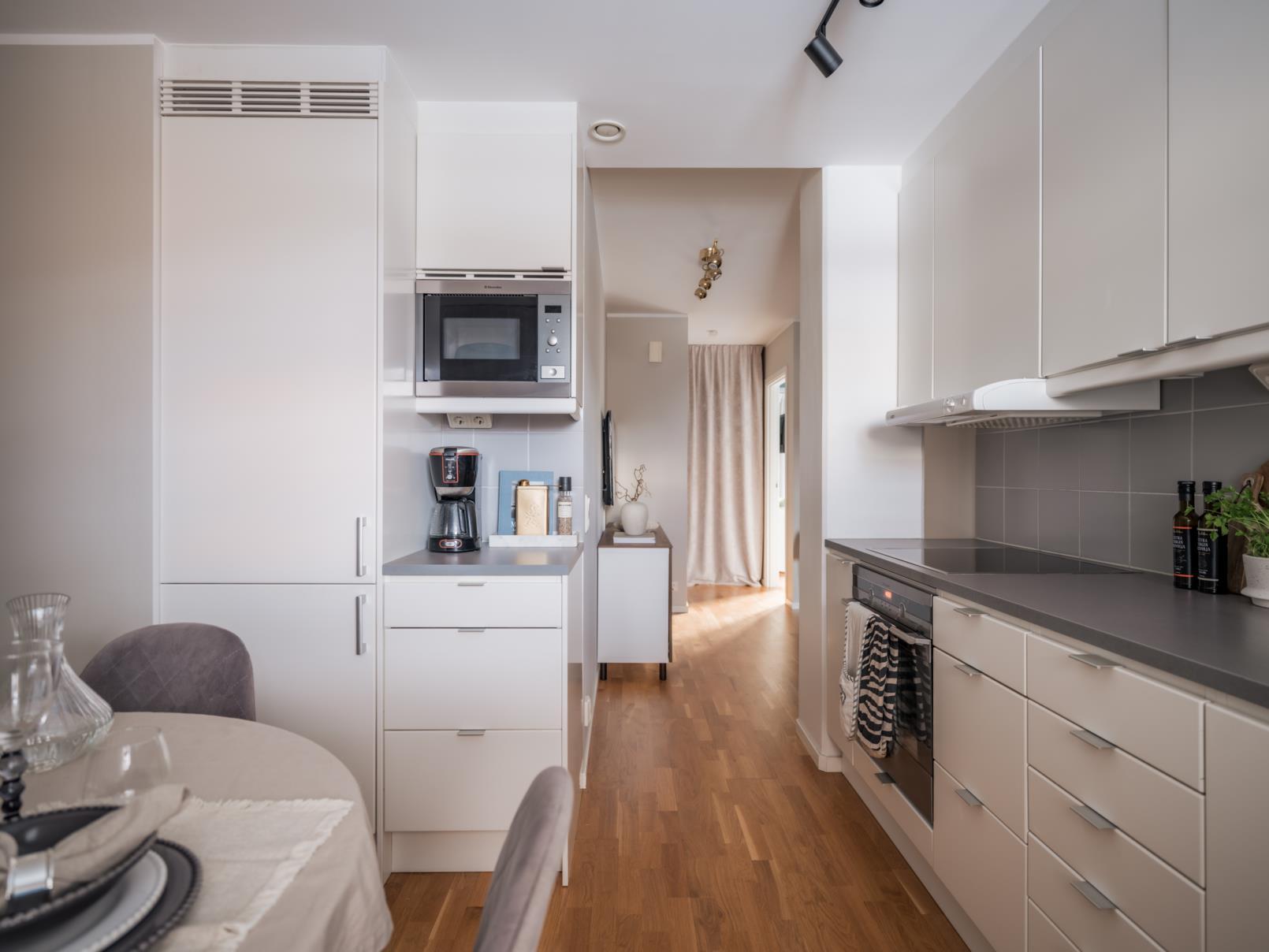 Ljust och smakfullt kök som målades om 2025 i en harmonisk ton som samspelar med köksinredningen. Köket är utrustat med spishäll, spisfläkt, inbyggd micro, integrerad kyl/frys och integrerad diskmaskin, alla från 2012. Parkettgolv ger ett enhetligt intryck och rummet bjuder på både arbetsytor och plats för matbord.