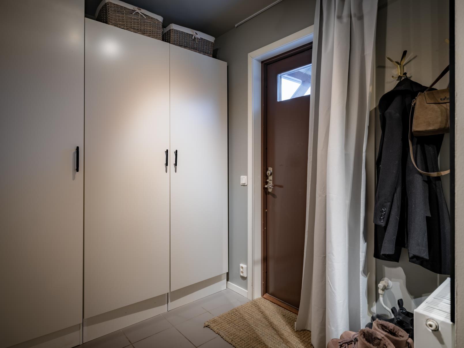 Välkomnande hall med klinkergolv och ljusa väggar som skapar en luftig och harmonisk känsla direkt vid entrén. Här finns gott om förvaring i garderober, vilket gör det enkelt att hålla ordning och reda.