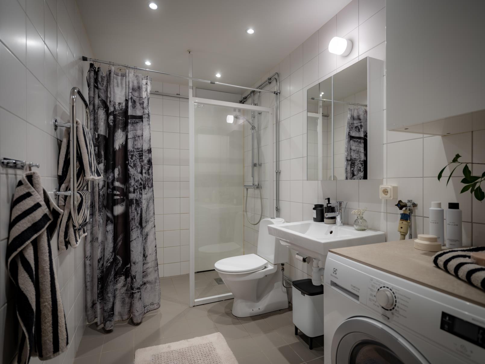 Stilrent badrum från 2012 med klinkergolv, golvvärme och frånluftsvärmepump. Utrustat med tvättmaskin och ljusa ytskikt.