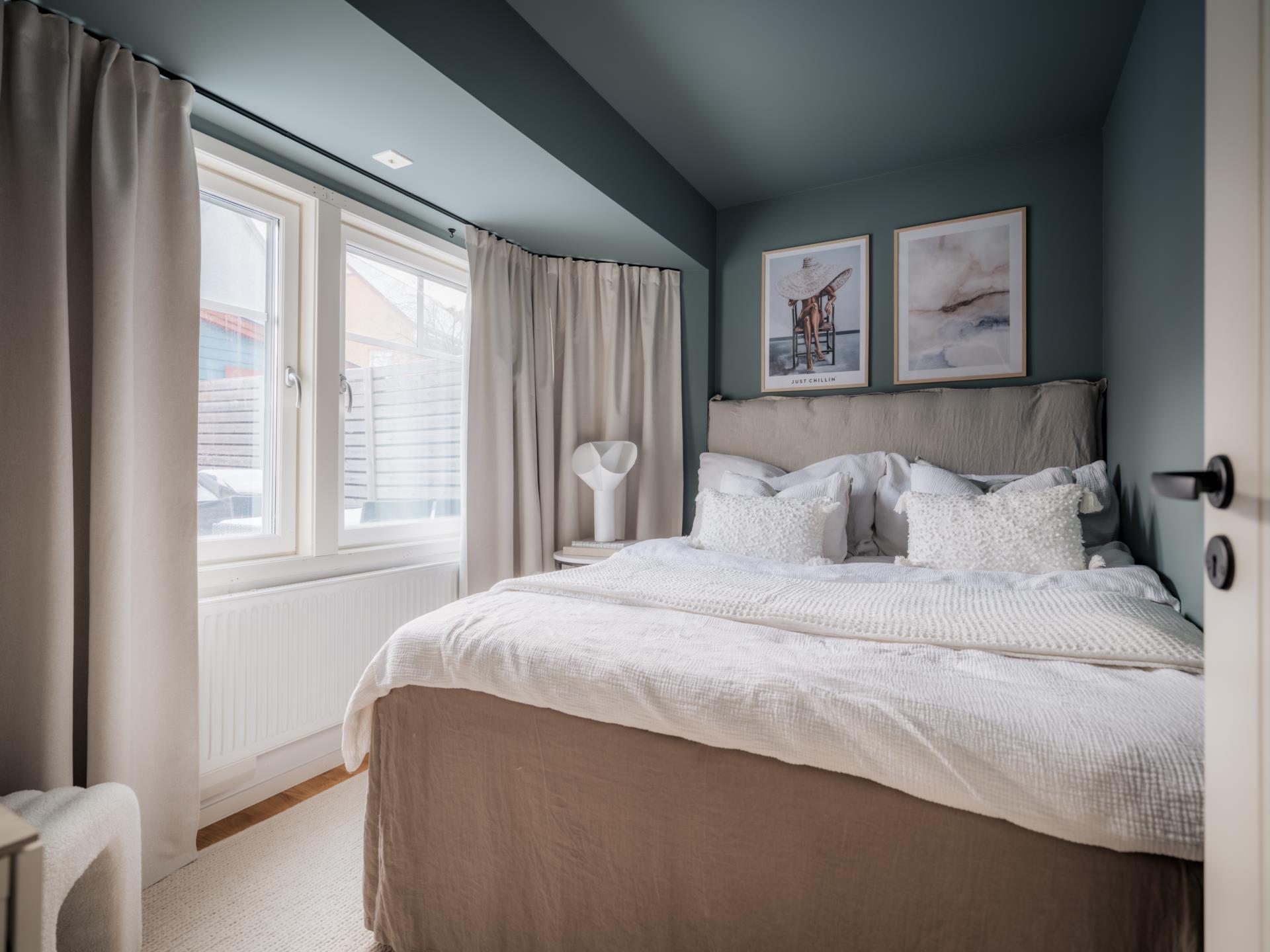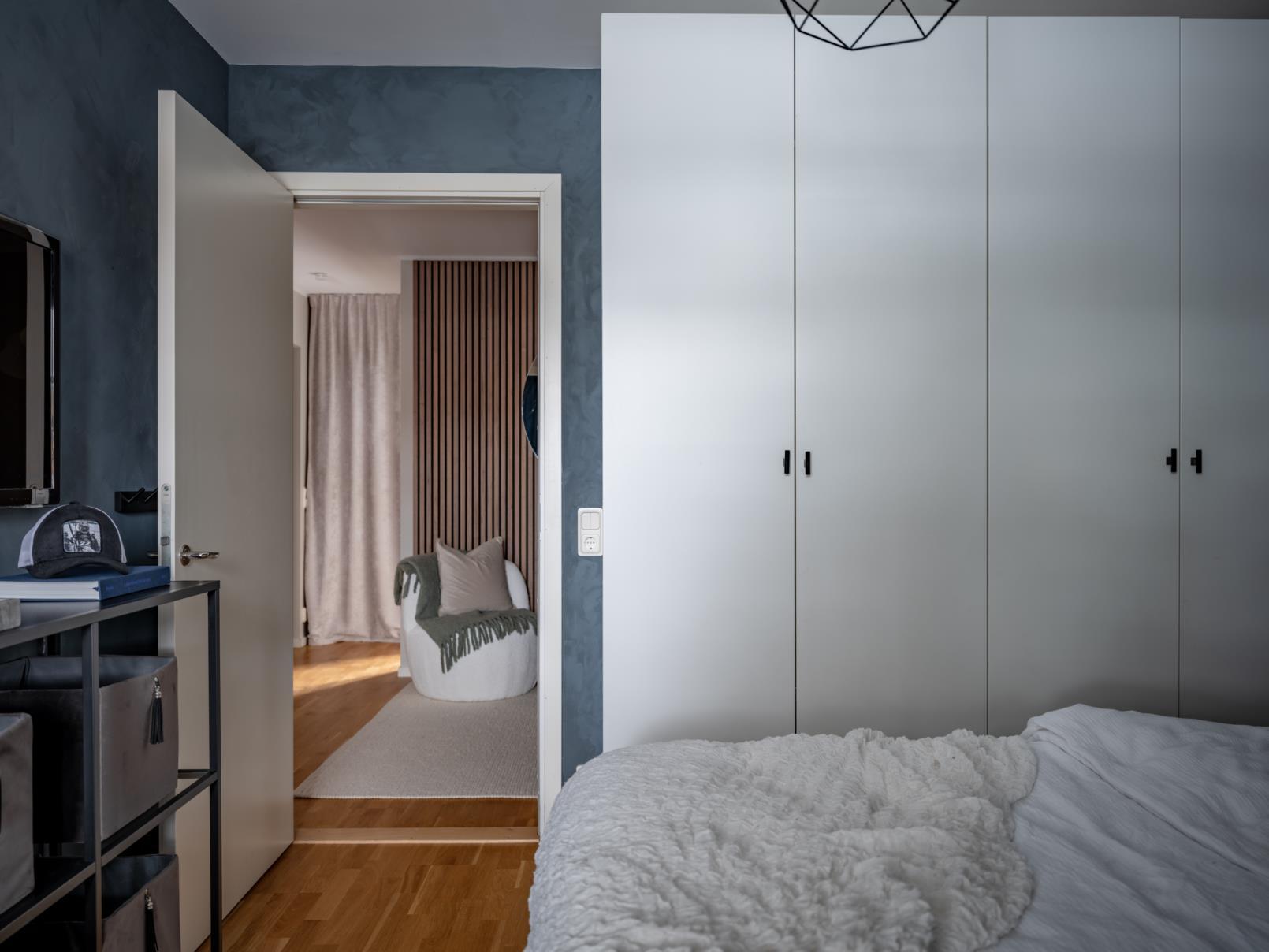 Smakfullt sovrum med blå väggar, målade 2020, och flertalet garderober som ger god förvaring. Parkettgolv.