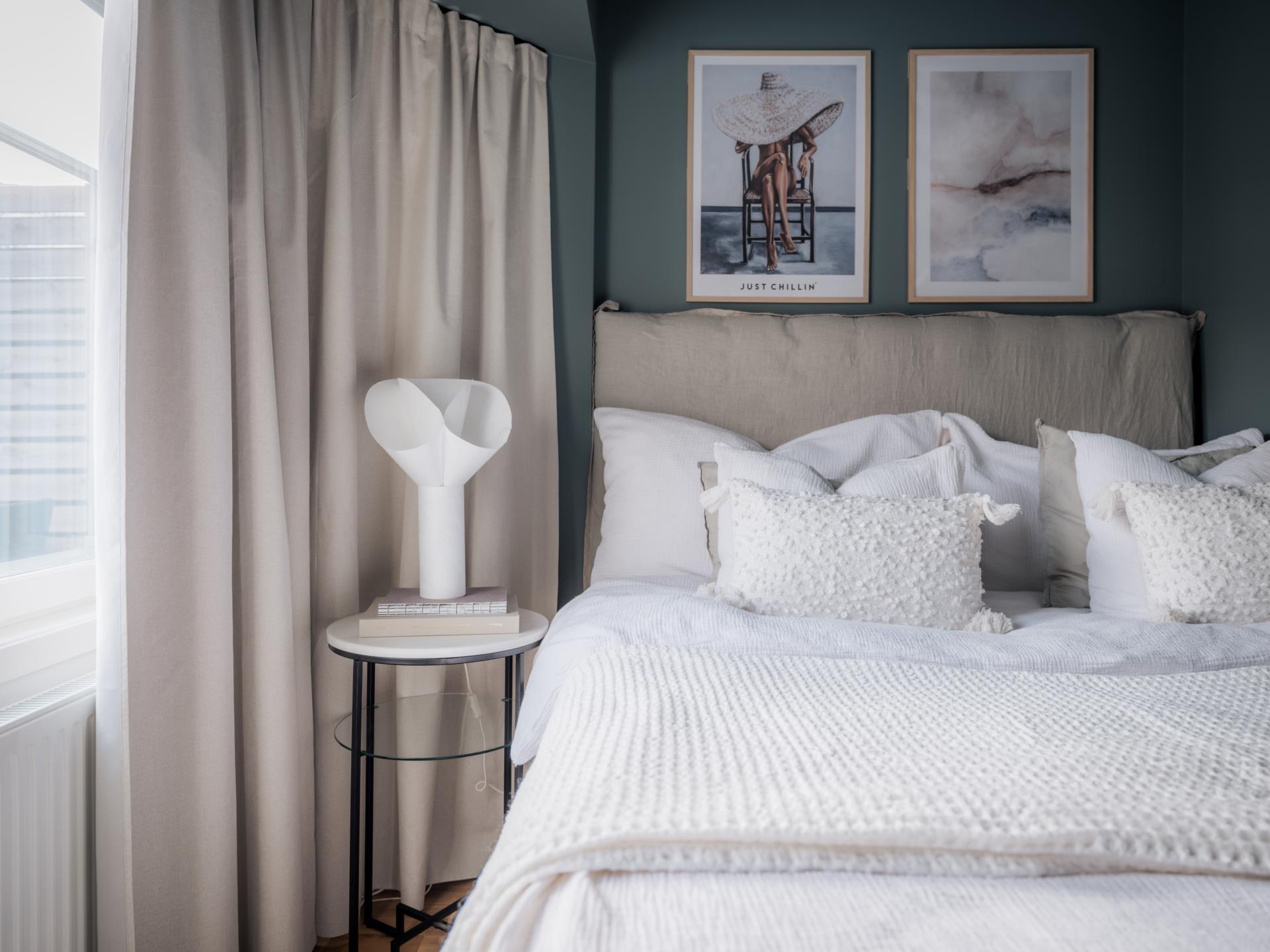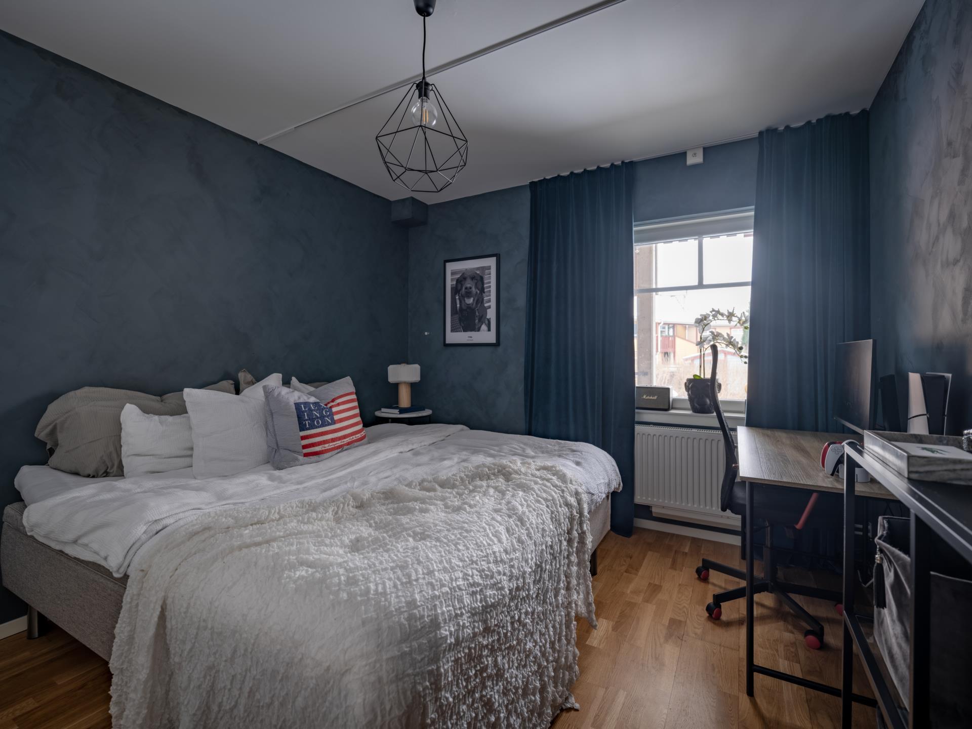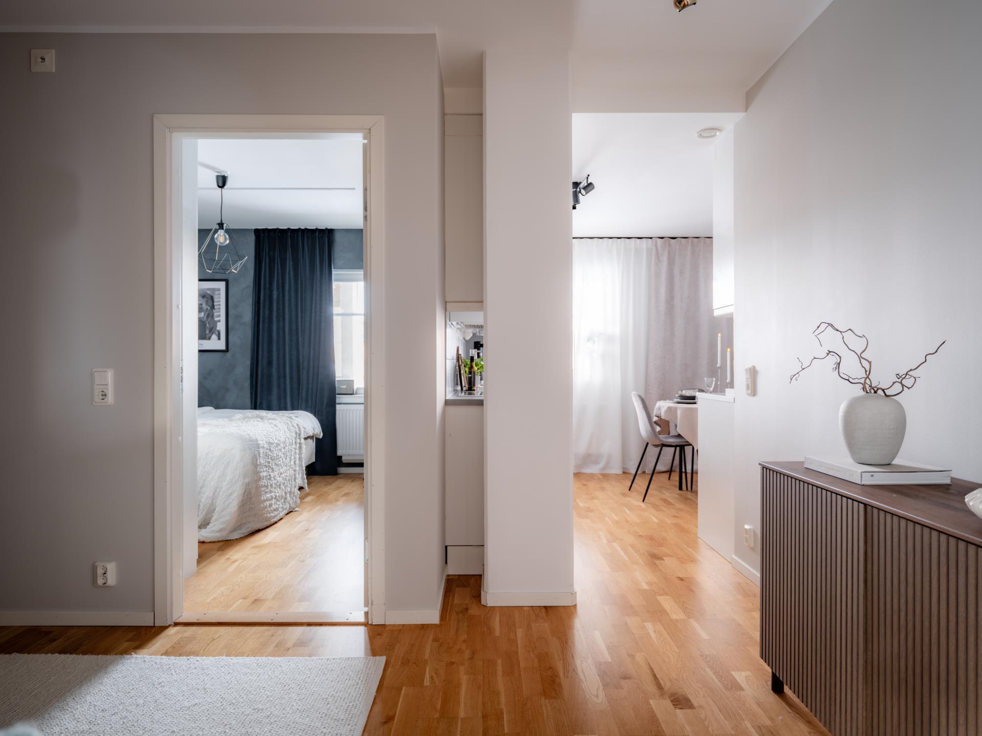 Föräldrasovrummet är målat i en elegant grön ton på både väggar och tak – en rofylld oas som välkomnar dig hem. Det andra sovrummet, med flertalet garderober, är smakfullt målat i en sober blå ton och fungerar perfekt som barnrum, gästrum eller hemmakontor. Badrummet är stilrent med klinkergolv och golvvärme samt utrustat med tvättmaskin – både praktiskt och bekvämt i vardagen. Hela lägenheten har parkettgolv i hall, kök, vardagsrum och sovrum, och fiber finns indraget.