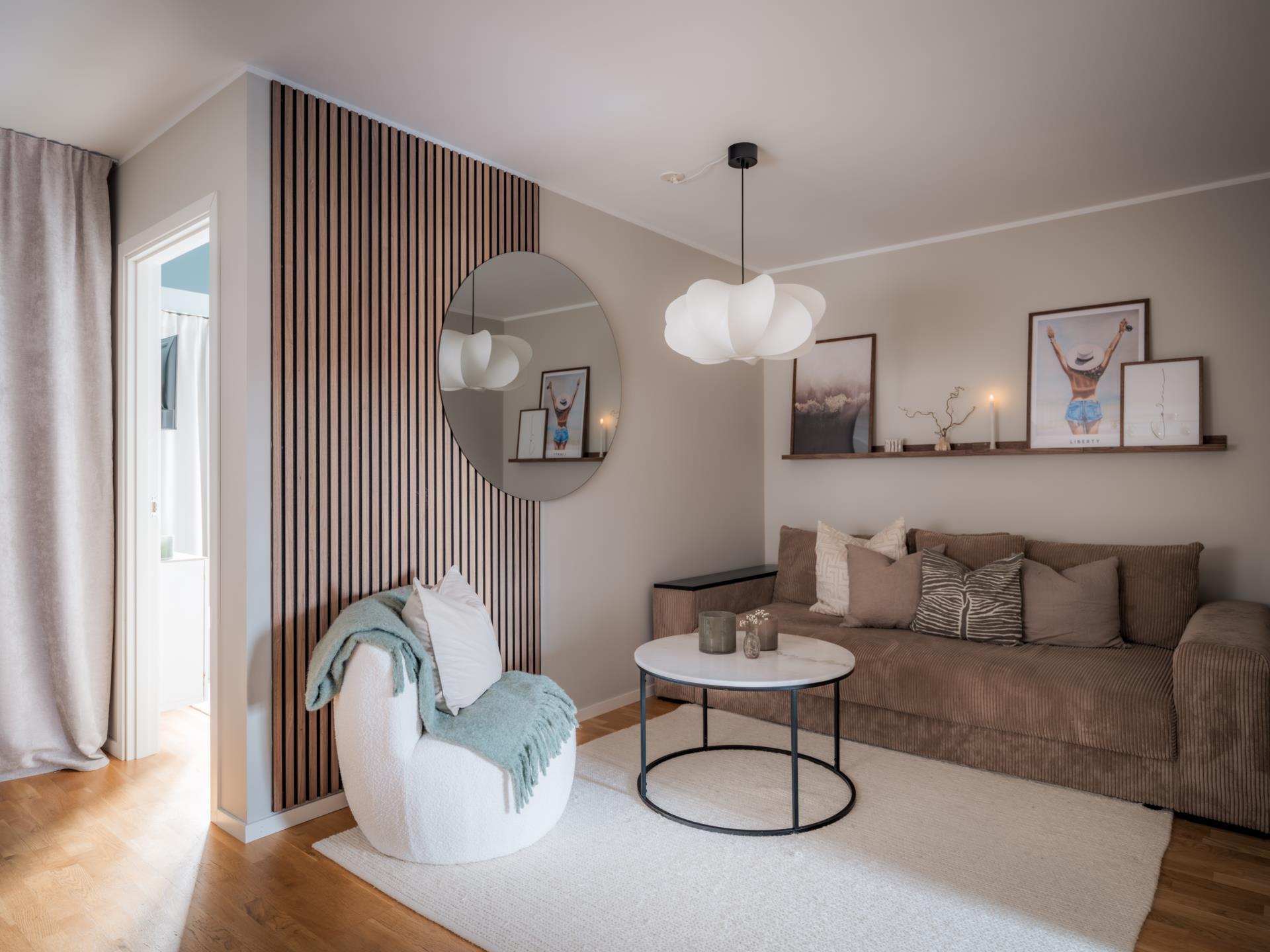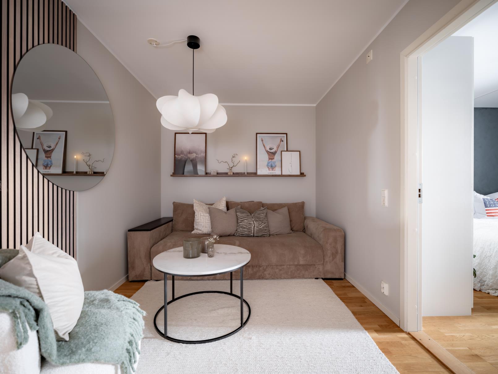 Mysigt och lättmöblerat vardagsrum med parkettgolv och ljusa väggar, målat om 2024. Rummet ligger centralt mellan de två sovrummen och blir hemmets naturliga samlingspunkt.